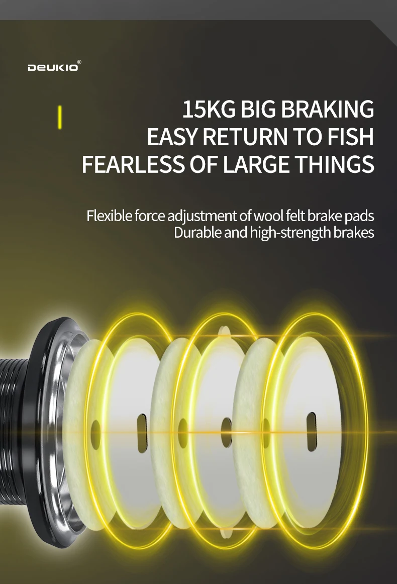 1.Fuerza de frenado súper grande de 15 kg, fácil de regresar a los peces, sin miedo a los objetos grandes; Pastillas de freno de fieltro de lana, ajuste flexible de la fuerza de descarga; Durable y resistente, con frenos de alta resistencia
