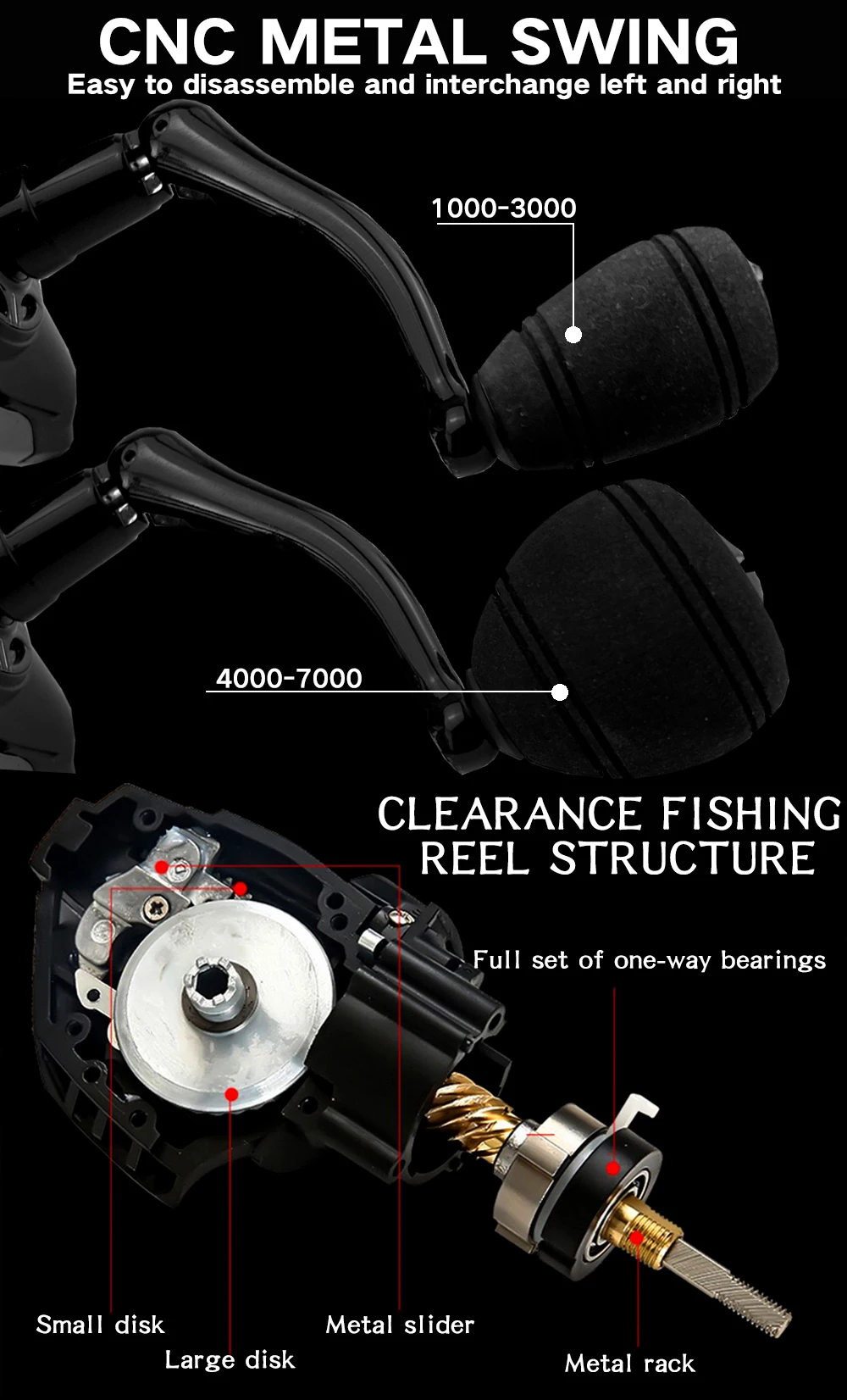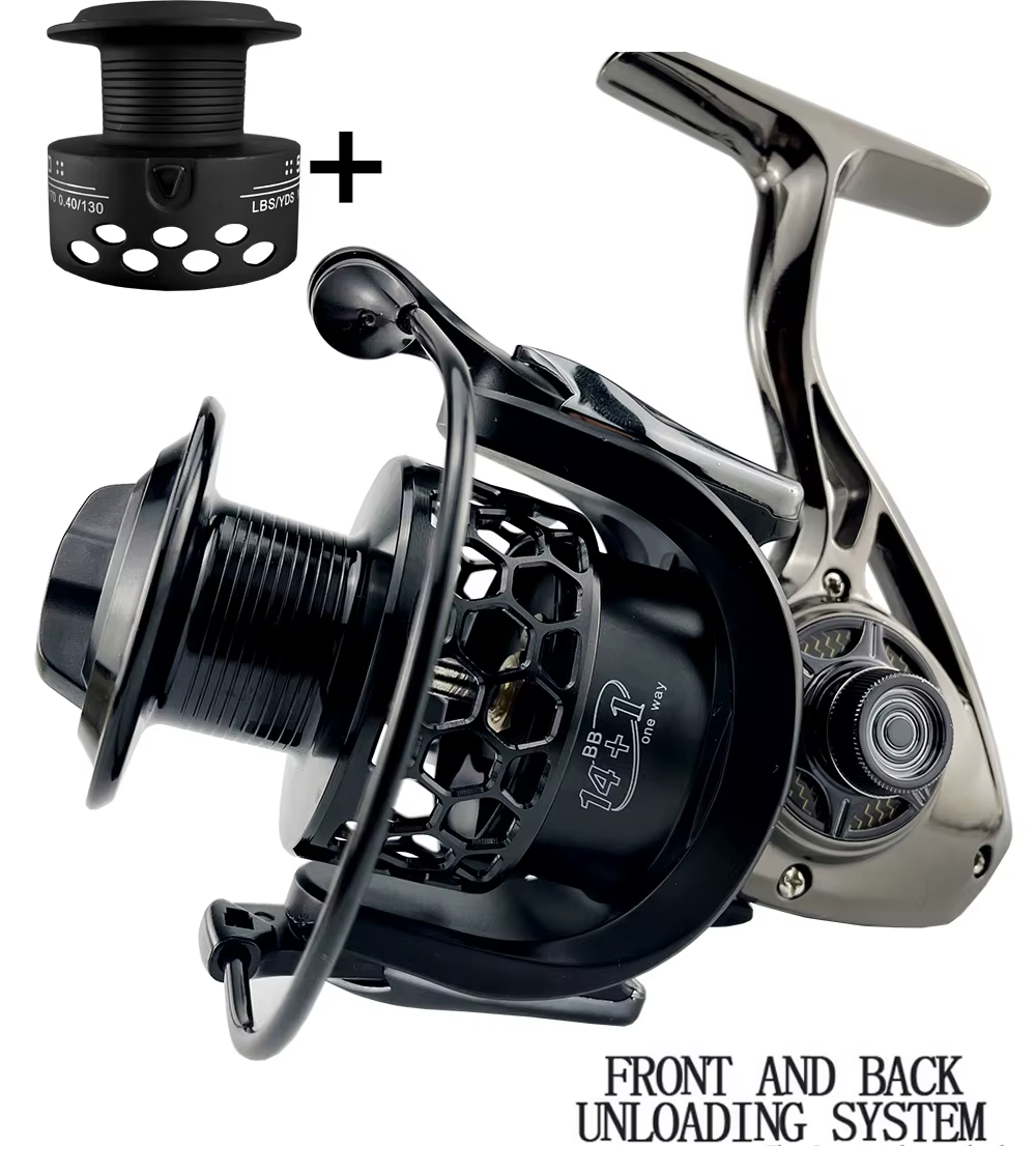 Carrete: todo de metal y un carrete de repuesto de plástico