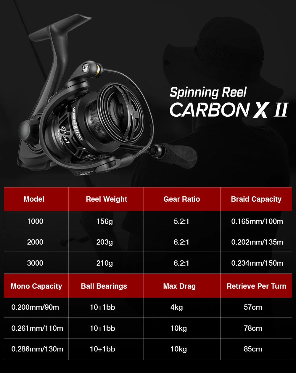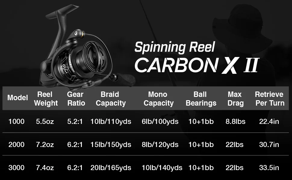 【Potente y estable】- El Carbon X II ofrece hasta 22 libras de resistencia potente de fibra de carbono.Un eje principal reforzado de acero inoxidable, un sistema de resistencia de fibra de carbono mejorado con nueva tecnología mejora el rendimiento de arrastre en un 15%.