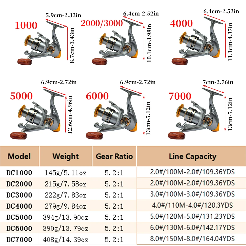 Basic Information Type: Spinning Fishing Reel Gear Ratio: 5.2:1 Spool: Metal Rock Arm: Left / Right Interchangeable Series: 1000 2000 3000 4000 5000 6000 7000