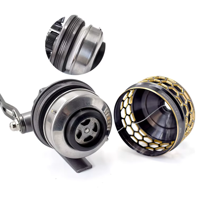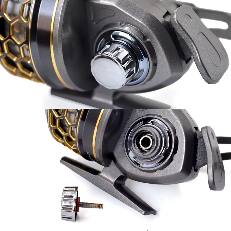Carretes de pescaNota especial:Asegúrese de presionar el botón de salida en la cola de la rueda cada vez antes de salir del hilo, de modo que el poste guía de hilo pueda retraerse hacia la cubierta sin bloquear la salida.Después de salir del hilo, el balancín se sacudirá y el poste saldrá para completar la acción de bobinado del hilo.