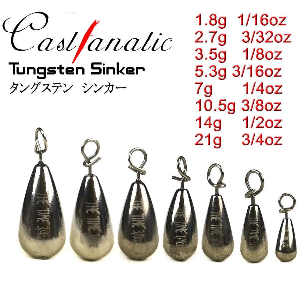 Tamaño3,5 g 5,3 g 7 g 10,5 g 14 g 21 g1/8 oz 3/16 oz 1/4 oz 3/8 oz 1/2 oz 3/4 ozMaterial: tungstenoPlataforma coincidente: Plataforma gratuita, Plataforma Drop Shot, Equipo web