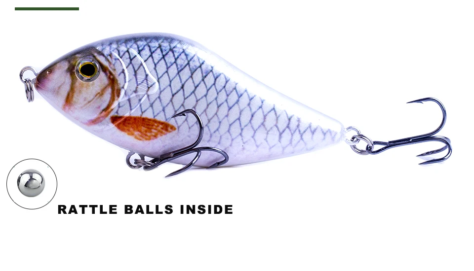3) Estructura general: la estructura interna utiliza la bola de acero para equilibrar la conducción. Cuando Tomas la línea, la bola en el cuerpo se transmite a otras partes y produce sonido, lo que puede llevar al pez a perseguir. La forma está hecha de acero al carbono con 2 anzuelos triples súper afilados para garantizar que los peces no se escapen. Esos jerkbaits son ideales para capturar especies marinas y de agua dulce.