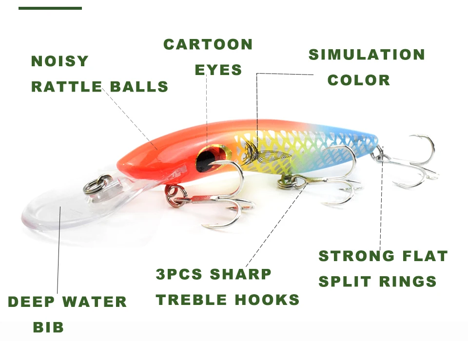 1) bien diseñado y bien hecho: lindos ojos de pez de dibujos animados con cuerpo impreso que atrae peces proporciona una excelente apariencia de Señuelos de Pesca.