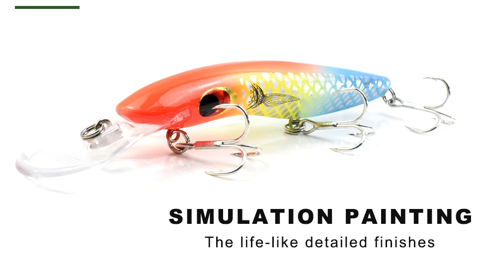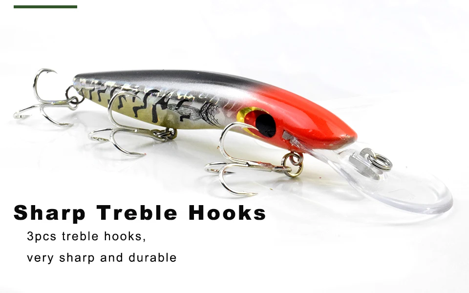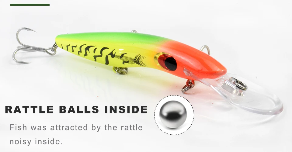 3) Estructura general: la estructura interna utiliza la bola de acero para equilibrar la conducción. Cuando tomas la línea, la bola del cuerpo se transmite a otras partes y produce sonido, lo que puede hacer que el pez persiga. La forma está hecha de acero al carbono con 3 anzuelos triples superafilados para garantizar que el pez no Escape. Esos cebos son ideales para capturar especies marinas y de agua dulce.
