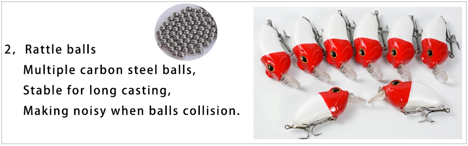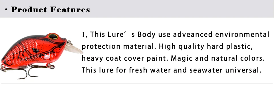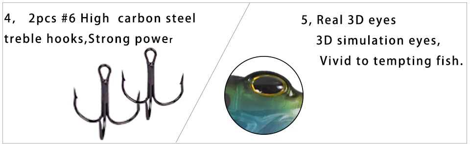 Tamaño: 70mm/2,8 pulgadasPeso: 14gEstado: flotanteGanchos: 2 uds. #6 anzuelos triples negros de alto carbono