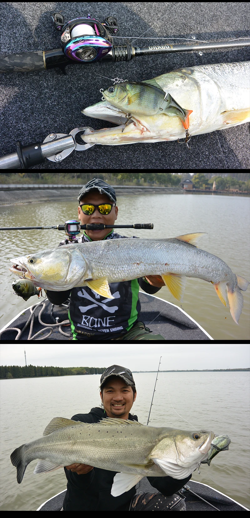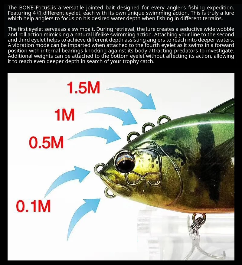 El Focus es un cebo articulado versátil diseñado para expediciones de pesca, especialmente al probar nuevas aguas en busca de su pez objetivo. Cuenta con un ojal 4 + 1, cada uno con su propia acción de natación única. Este es realmente un señuelo que ayuda a los pescadores a centrarse en la profundidad de agua deseada al pescar en diferentes terrenos. El primer ojal sirve como cebo para nadar. Durante la recuperación, el señuelo crea una seductora acción amplia de Bamboleo y balanceo, imitando una acción natural realista. Unir su línea al segundo y tercer ojal ayuda a lograr diferentes profundidades, ayudando a los pescadores a alcanzar una columna de agua más profunda. El modo de vibración se puede impartir al unir su línea al cuarto ojal, nadando en una posición hacia adelante mientras suena, atrayendo a cualquier depredador en las cercanías. Se pueden conectar pesos adicionales al ojal inferior sin afectar su acción, lo que le permite alcanzar cualquier profundidad en busca de su captura de trofeos.