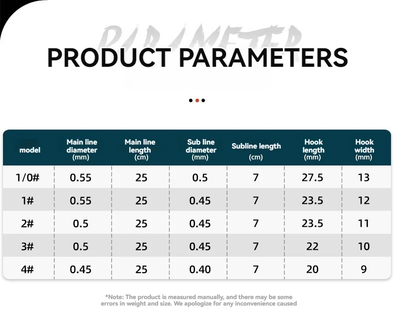 1 #-Longitud del gancho: 2,35 cm-Ancho del gancho: 1,2 cm-Longitud de la línea principal: 132cm-Diámetro de la línea principal: 0,5mm-Longitud del tippet: 5,5 cm-Diámetro del tippet: 0,4mm.
