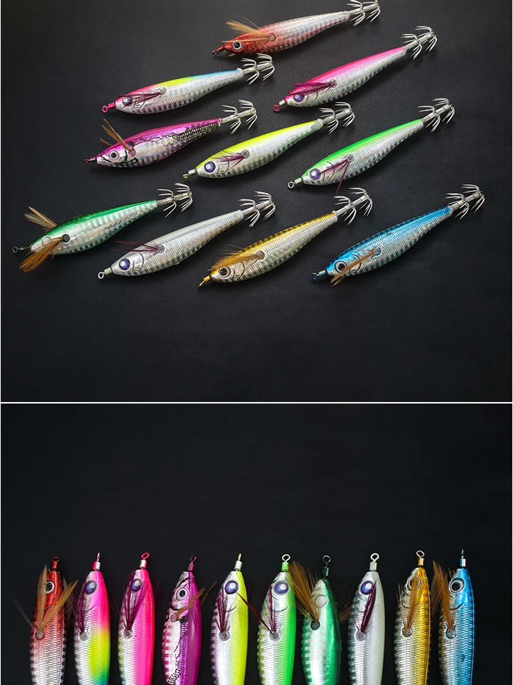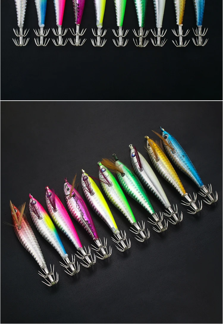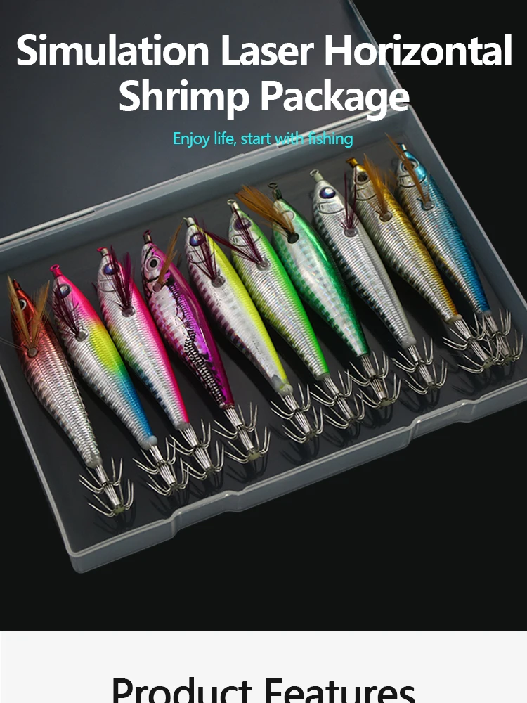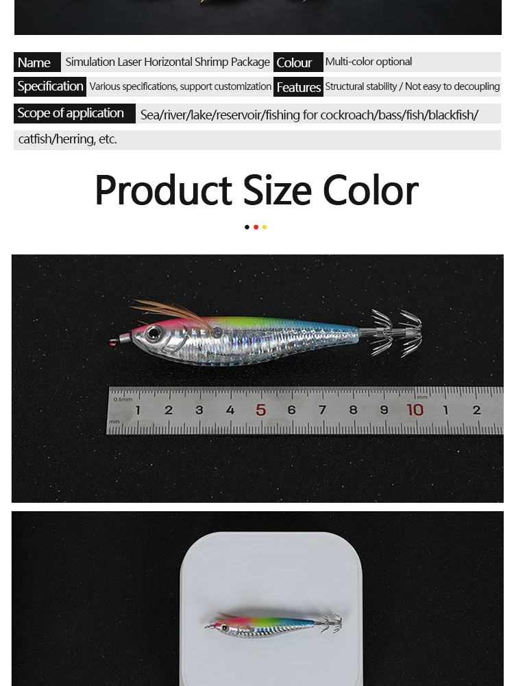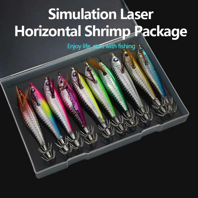 Cebo artificial de madera para Camarón, juego de anzuelos de calamar, simulación láser horizontal, gancho de pesca falso, 10 unidades