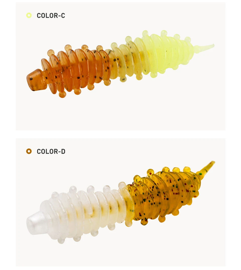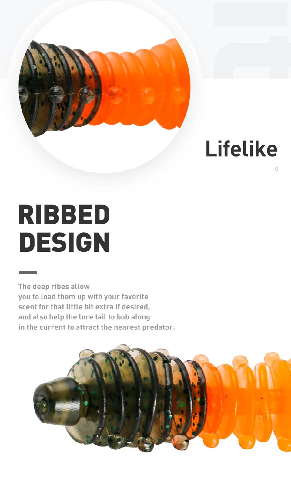 ︎︎︎︎︎︎︎︎︎︎︎︎︎︎Ribbed Diseño: Las costillas profundas le permiten cargarlas con su aroma favorito para ese pequeño extra si lo desea, y también ayuda a la cola del señuelo a moverse a lo largo de la corriente para atraer al depredador más cercano