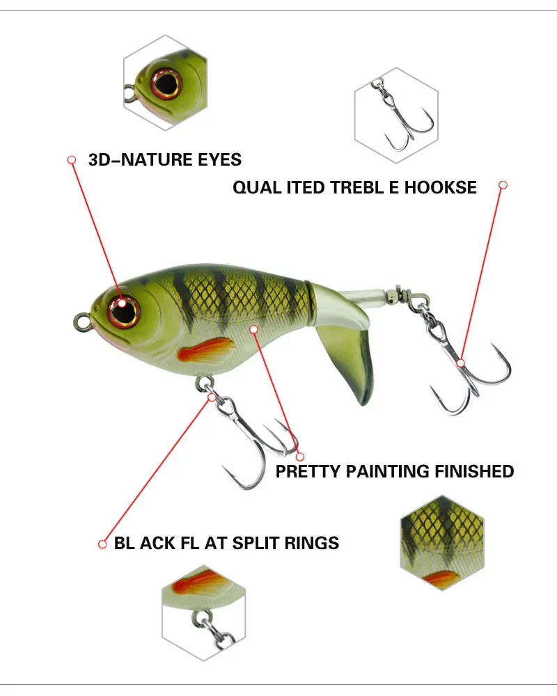 1.DISEÑO ÚNICO: El juego de cebo está diseñado con una cola giratoria de hoja que hace salpicaduras fuertes mientras se mueve por la superficie, creando ruido y emoción que los peces no pueden ignorar.También es "resistente al rodamiento" y funciona bien a un amplio rango de velocidades.Es interesante, cuando un lubina muerde el cebo, su cola se cierra para evitar que el lubina lo escupa.