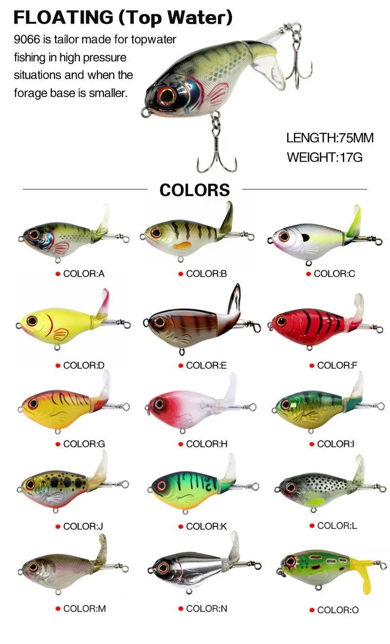 75mm/17g corredor de carretera cebo falso hélice superficie tractor cebo duro con ganchos para lubina Lucio perca cola giratoria aparejos de pesca