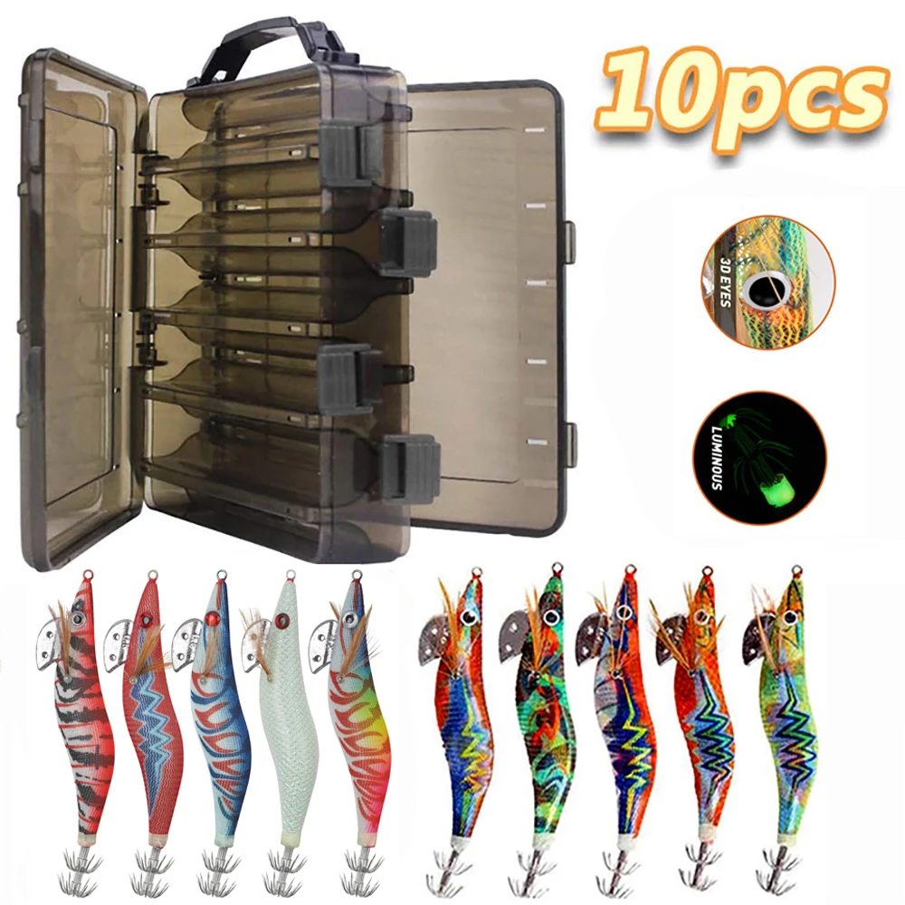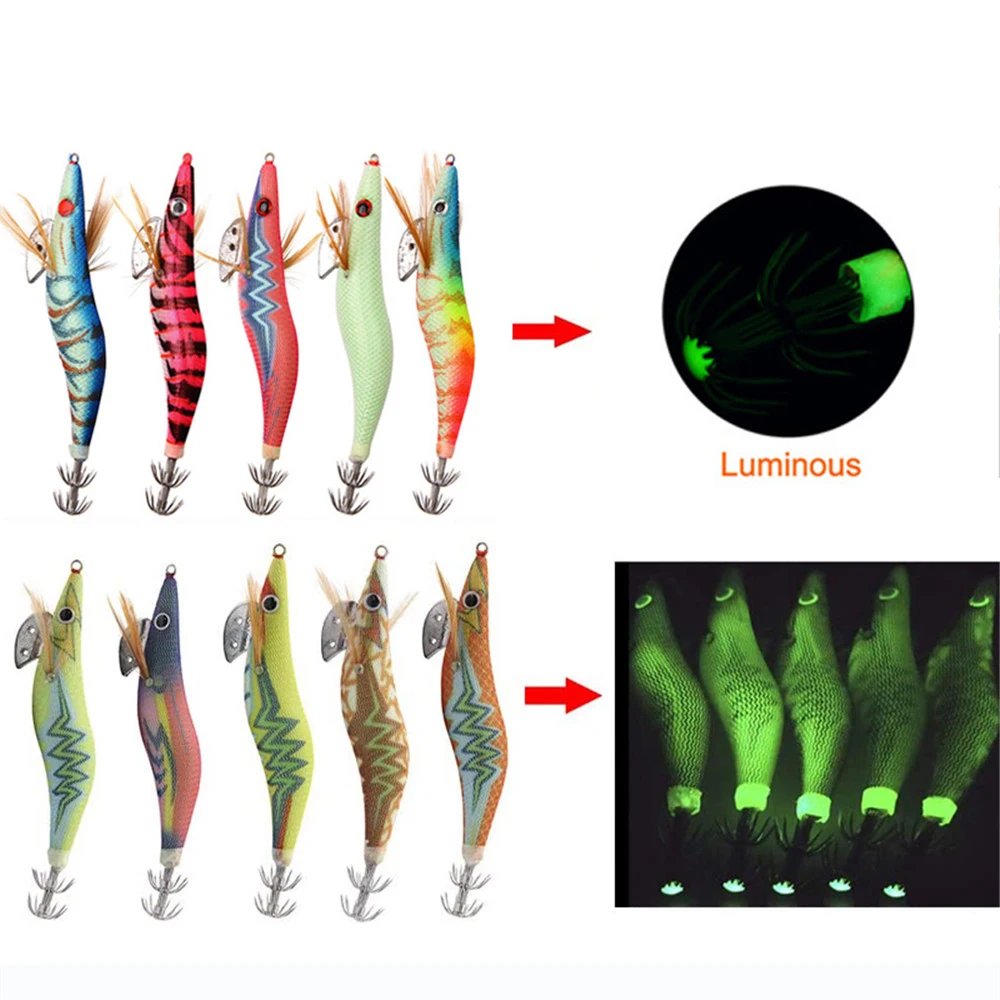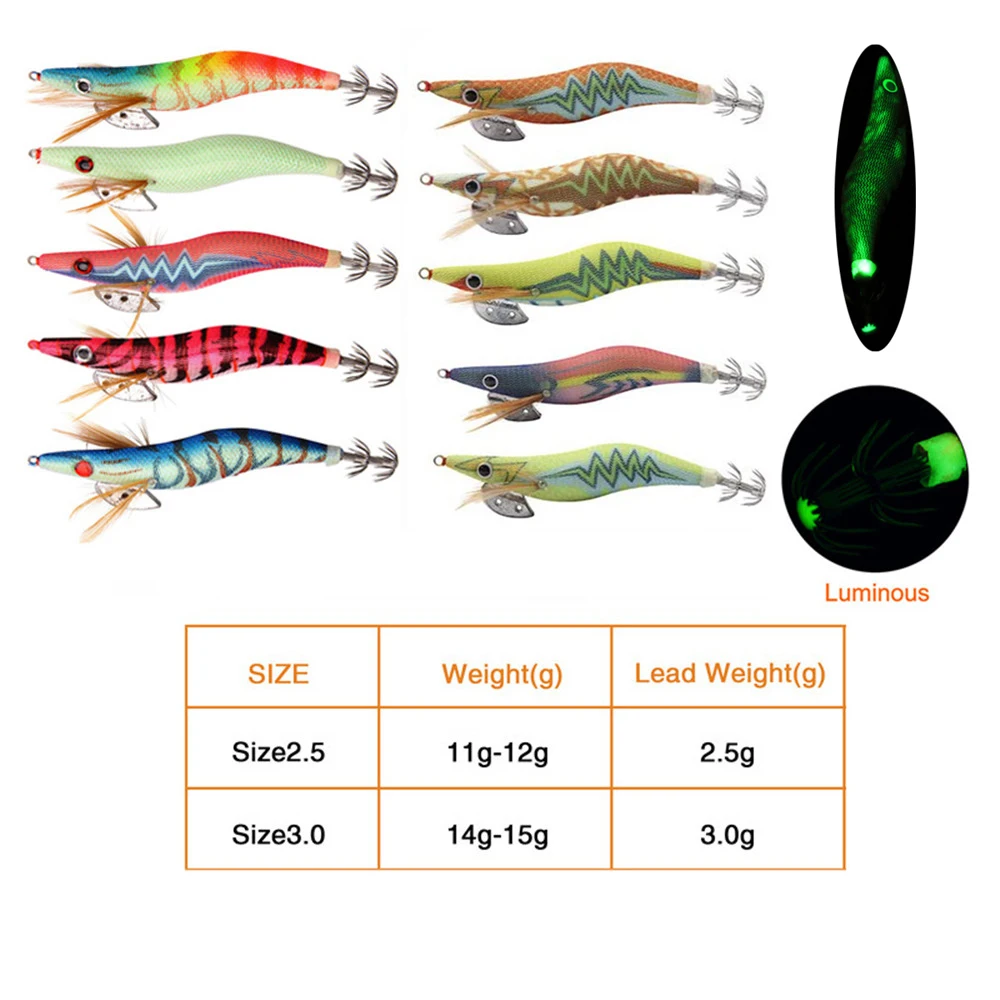 Señuelo de calamar de madera, anzuelos de pesca, cebo de pulpo, 12g, 14,5g, sepia, cebo Artificial luminoso, anzuelo de pesca, 10 Uds.
