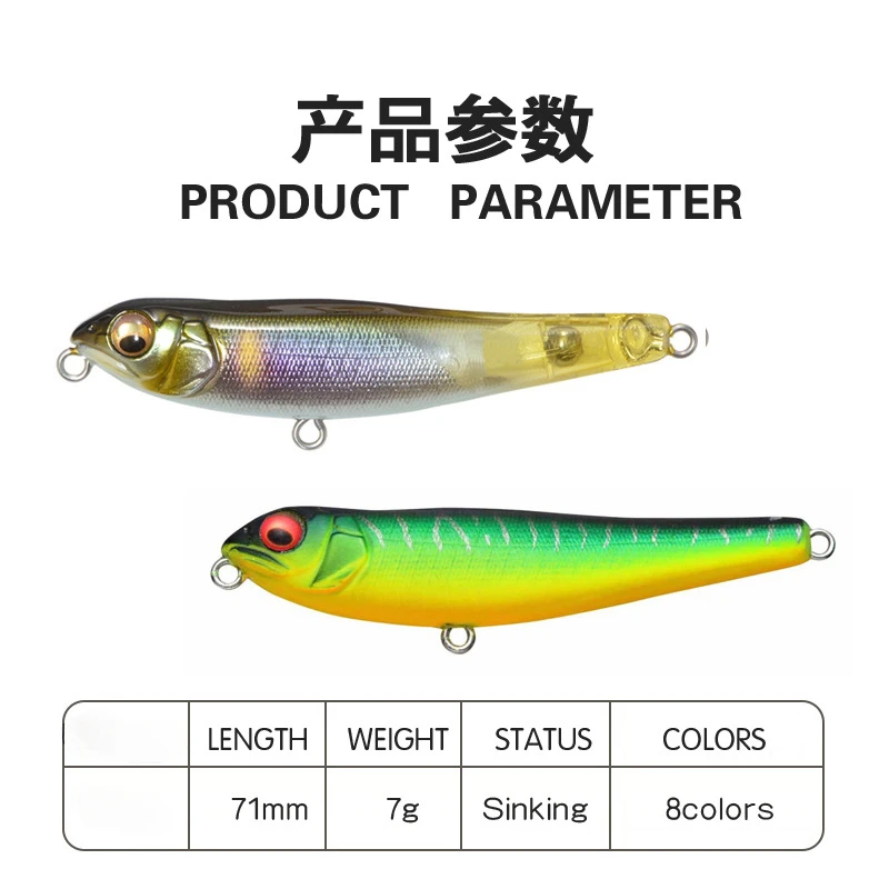 Luya Bait Lápiz de agua de hundimiento lento Luya Cebo duro Cebo 71mm/7g Biónico Enderezar La Boca del caballo