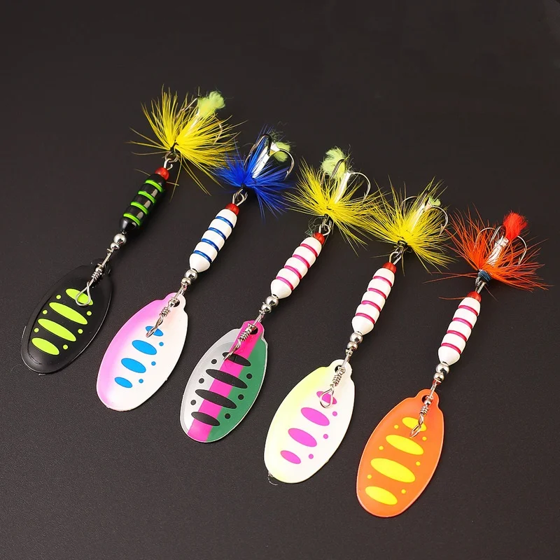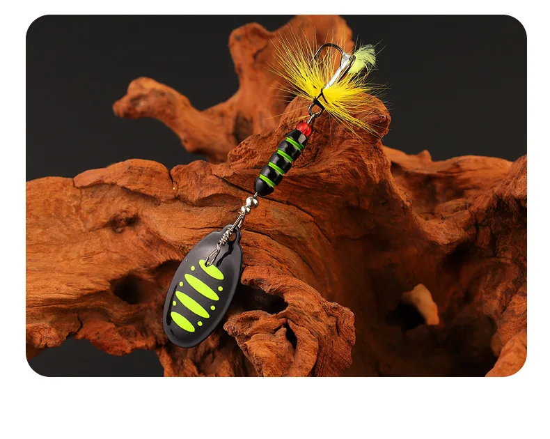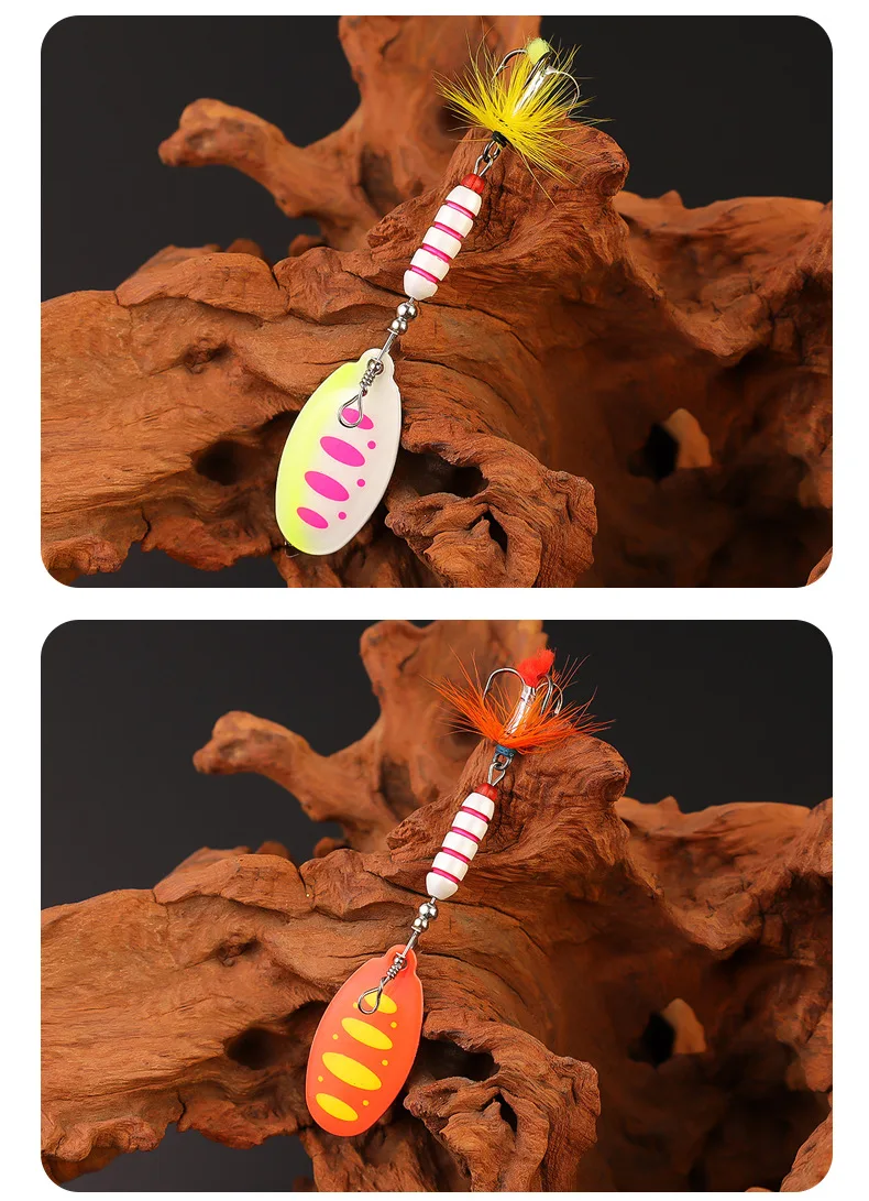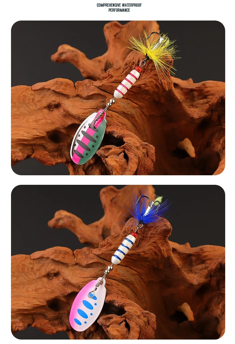 4 Señuelo giratorio con un anzuelo triple de acero con alto contenido de carbono y afilado y pegajoso con cola de plumas para agregar una acción fluida bajo el agua, se dirige a la mayoría de los peces como trucha, lubina, tipo de pez y bluegill.