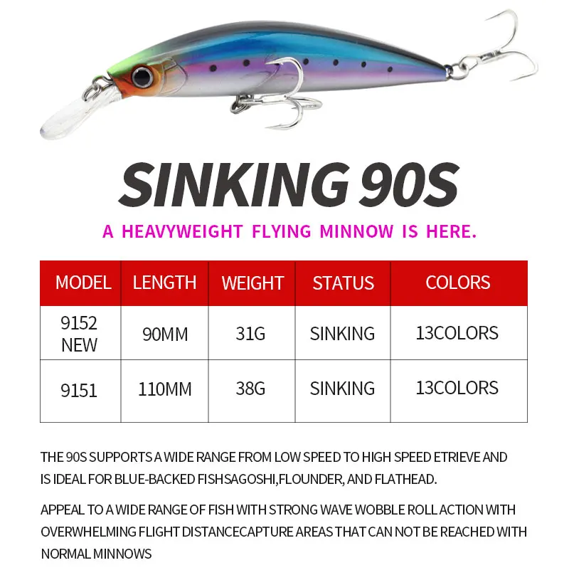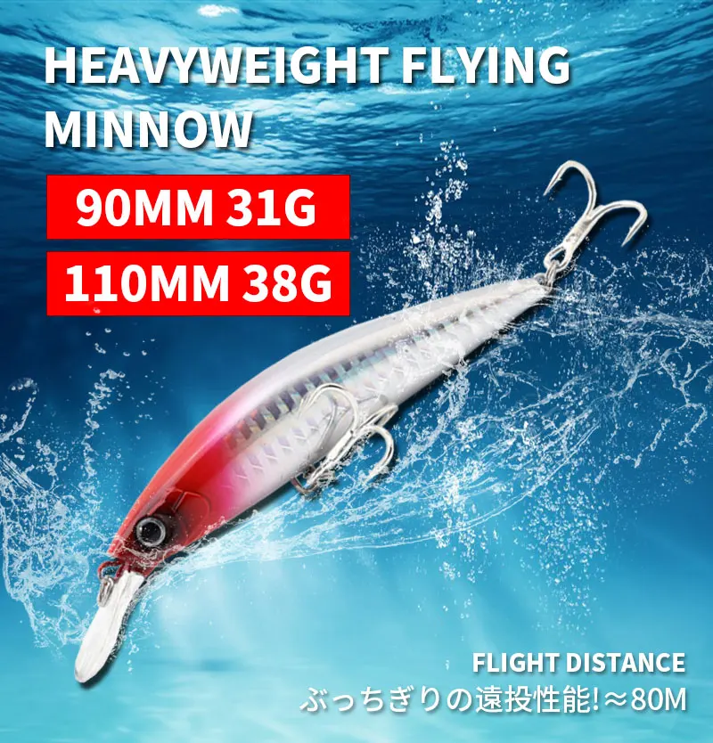 Cebo de pececillo de hundimiento pesado, 30g, 90mm, señuelo de trucha de lubina, cebo Artificial de fundición larga, equipo de natación curricán para buceo en agua salada
