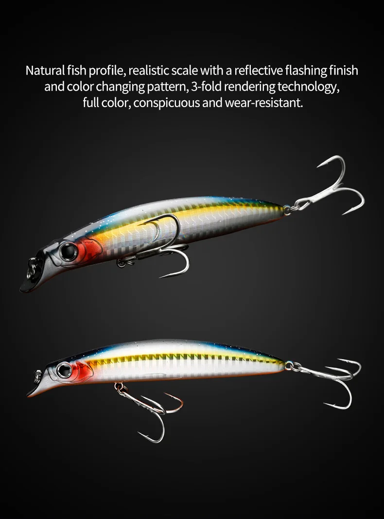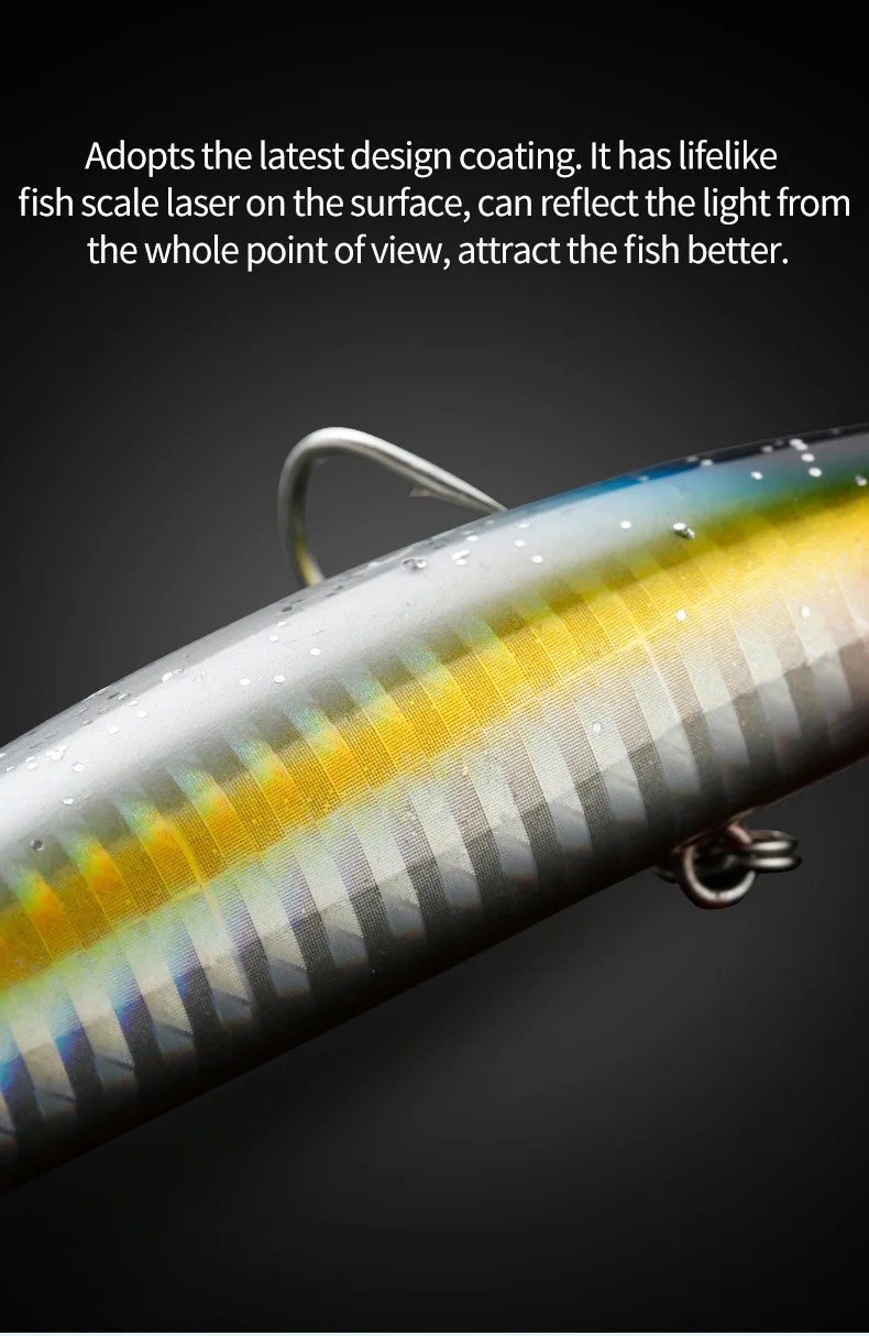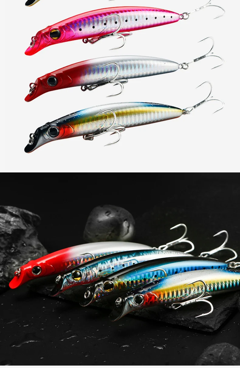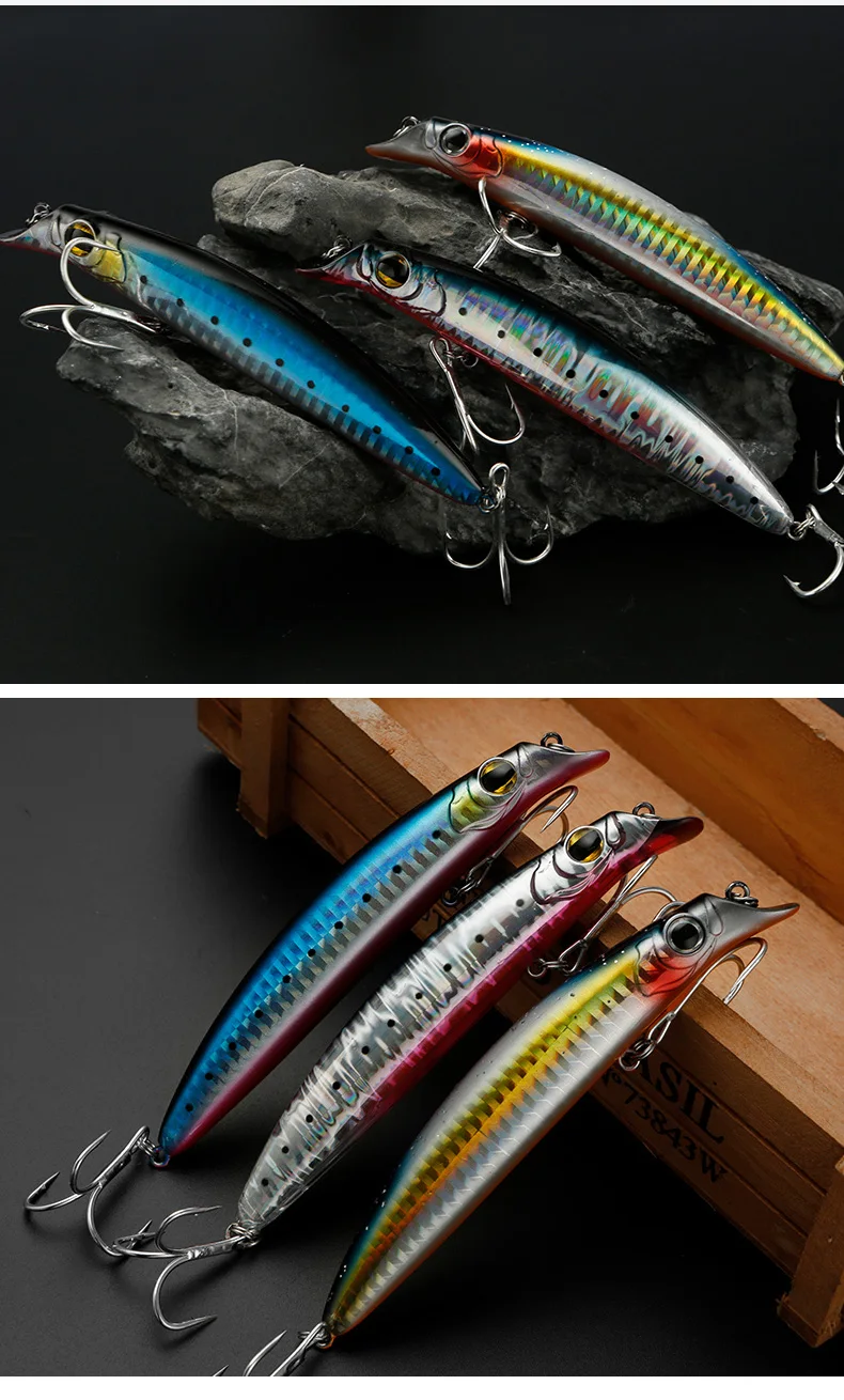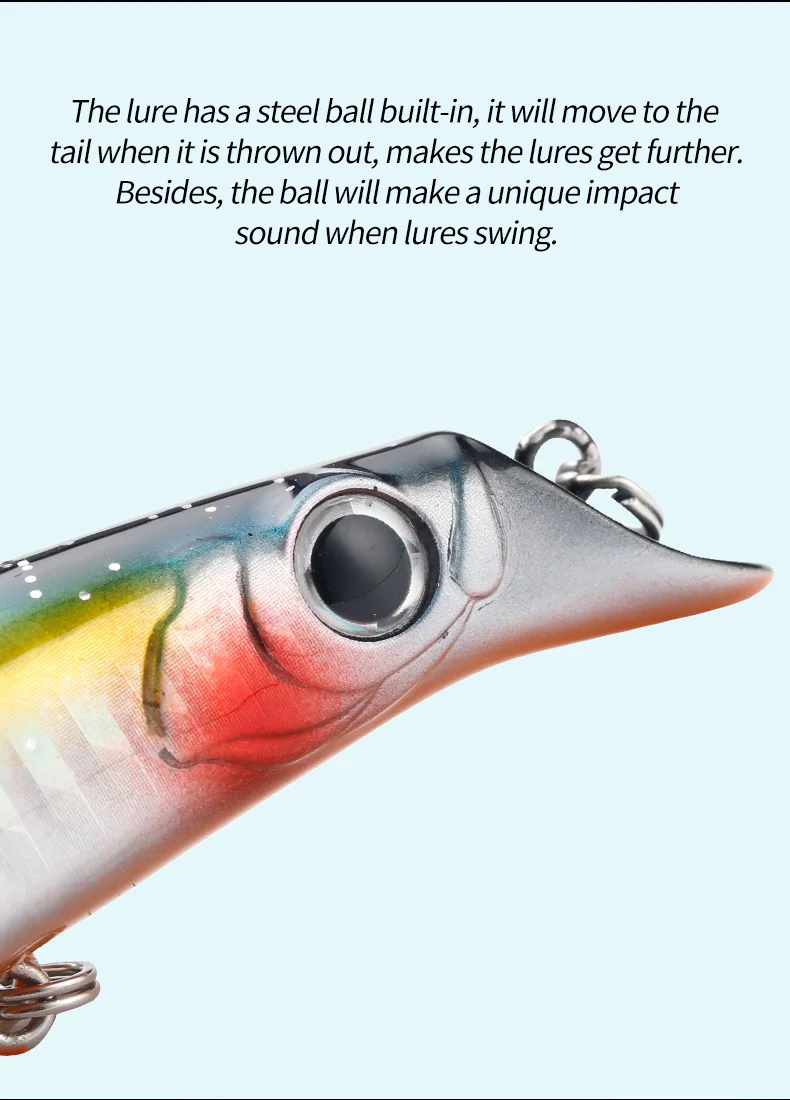 Los señuelos de lubina tienen una bola de gravedad incorporada para un lanzamiento largo y preciso y estabilidad postural y hacen algo de ruido para atraer la atención de los peces.