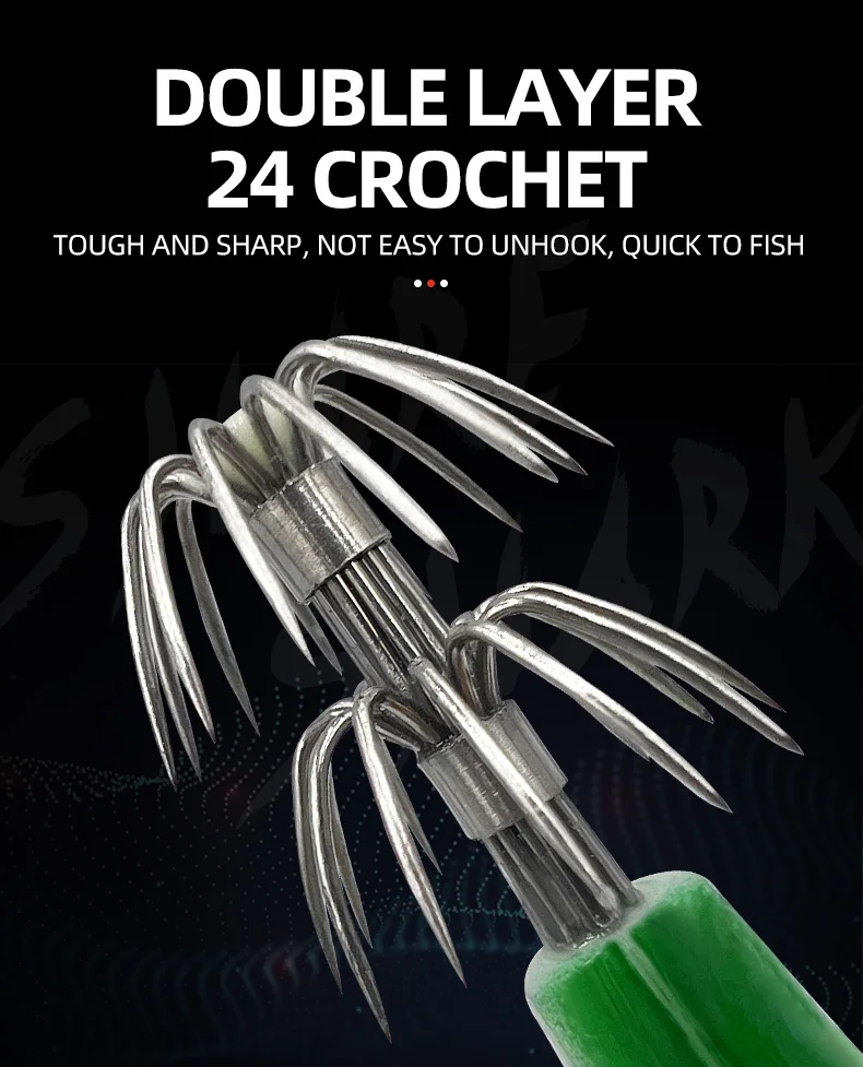 【Potente diseño de gancho】:El anzuelo para camarones de calamar cuenta con anzuelos afilados y resistentes que penetran rápidamente en la boca de los peces y proporcionan efectos de pesca seguros.El ángulo perfectamente curvado del anzuelo aumenta la retención de peces, minimizando las posibilidades de que los peces se escapen.