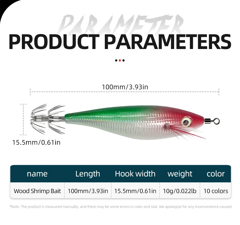 Nombre del productoCebo para jigging de calamarLongitud10 cm/3,93 pulgadasPeso10 gramosColor10 colores