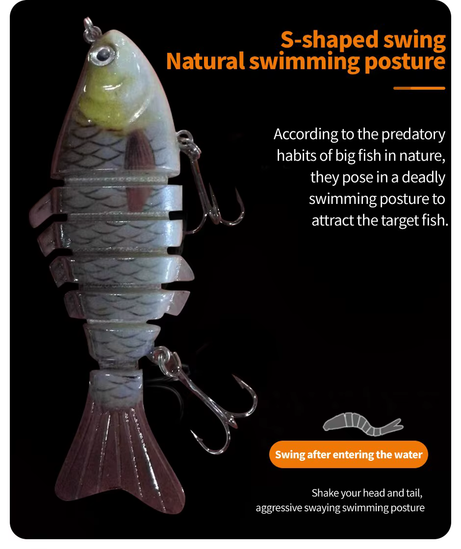 1) S-Movimiento de natación a cualquier velocidad-Las piezas del cuerpo se conectan con las telas textiles permite que estos señuelos se muevan de lado a lado como un pez real nadaría.