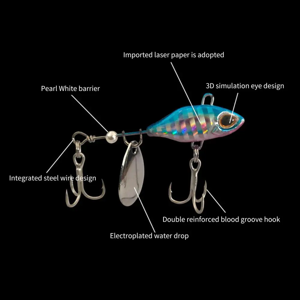 Eje de rotación en forma de U y diseño de lentejuelas de rotación de alta velocidad que brinda un mejor efecto de señuelo. El diseño corporal reflectante trae estimulación sensorial y atrae al pez objetivo para que lo ataque.