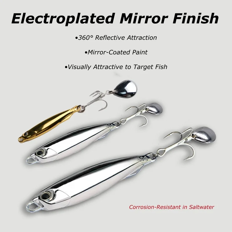 1.Superficie del espejo: el señuelo presenta una superficie similar a un espejo que refleja la luz, lo que lo hace muy visible para los peces desde todos los ángulos.