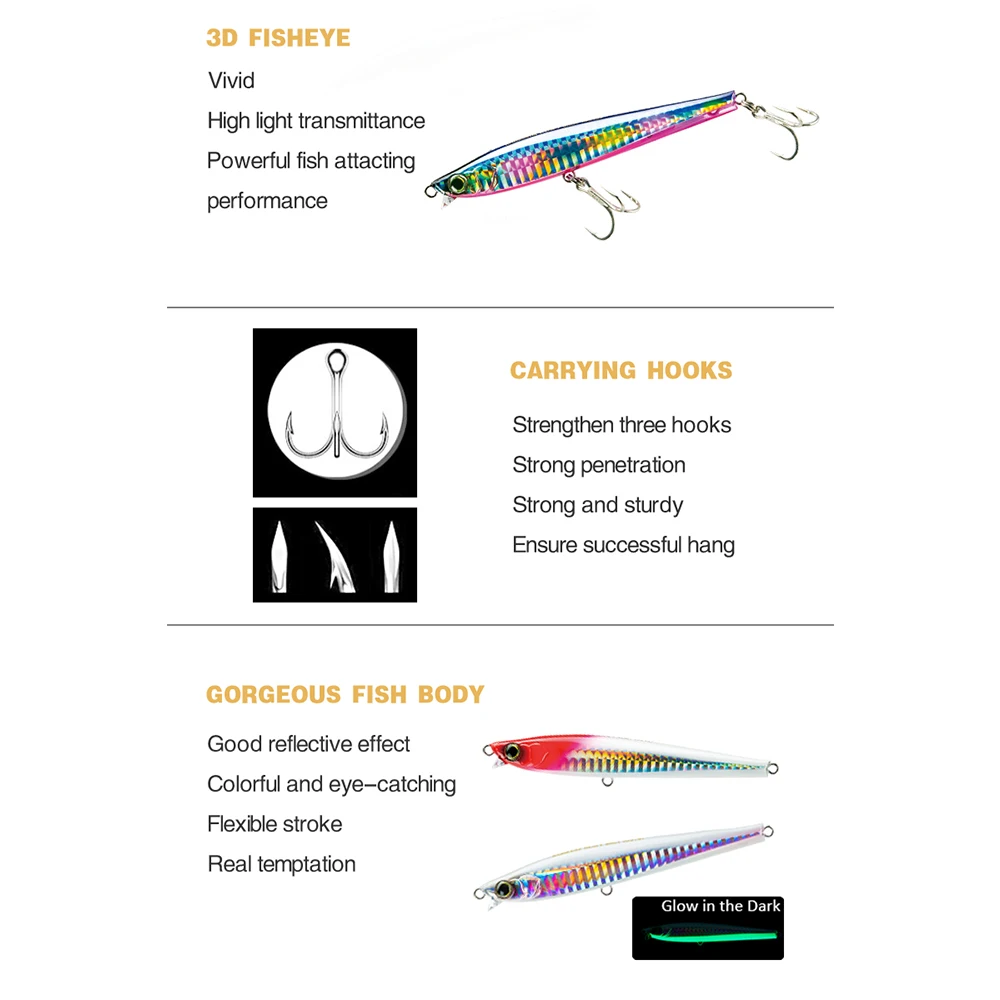 -Sistema de movimiento del centro de gravedad de acero de tungsteno, fundición ultralarga -Equipo nuevo sistema de movimiento del centro de gravedad, el centro de gravedad rebota automáticamente para controlar con precisión el movimiento en el agua. -La forma aerodinámica del cuerpo crea una distancia de lanzamiento súper larga. -Invite a los peces con un sonido llamativo -Reacciona rápidamente al trabajo de la varilla, produciendo una postura de natación flexible que tiene un alto rendimiento de natación. -Diseño luminoso, satisface tus diferentes necesidades -2 ganchos de agua salada, buena penetración y rendimiento anticorrosión, no le da a los peces ninguna oportunidad de escape. El paquete incluye: 1 ud. De cebos de pececillo
