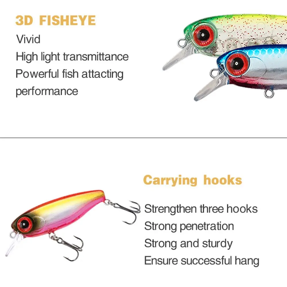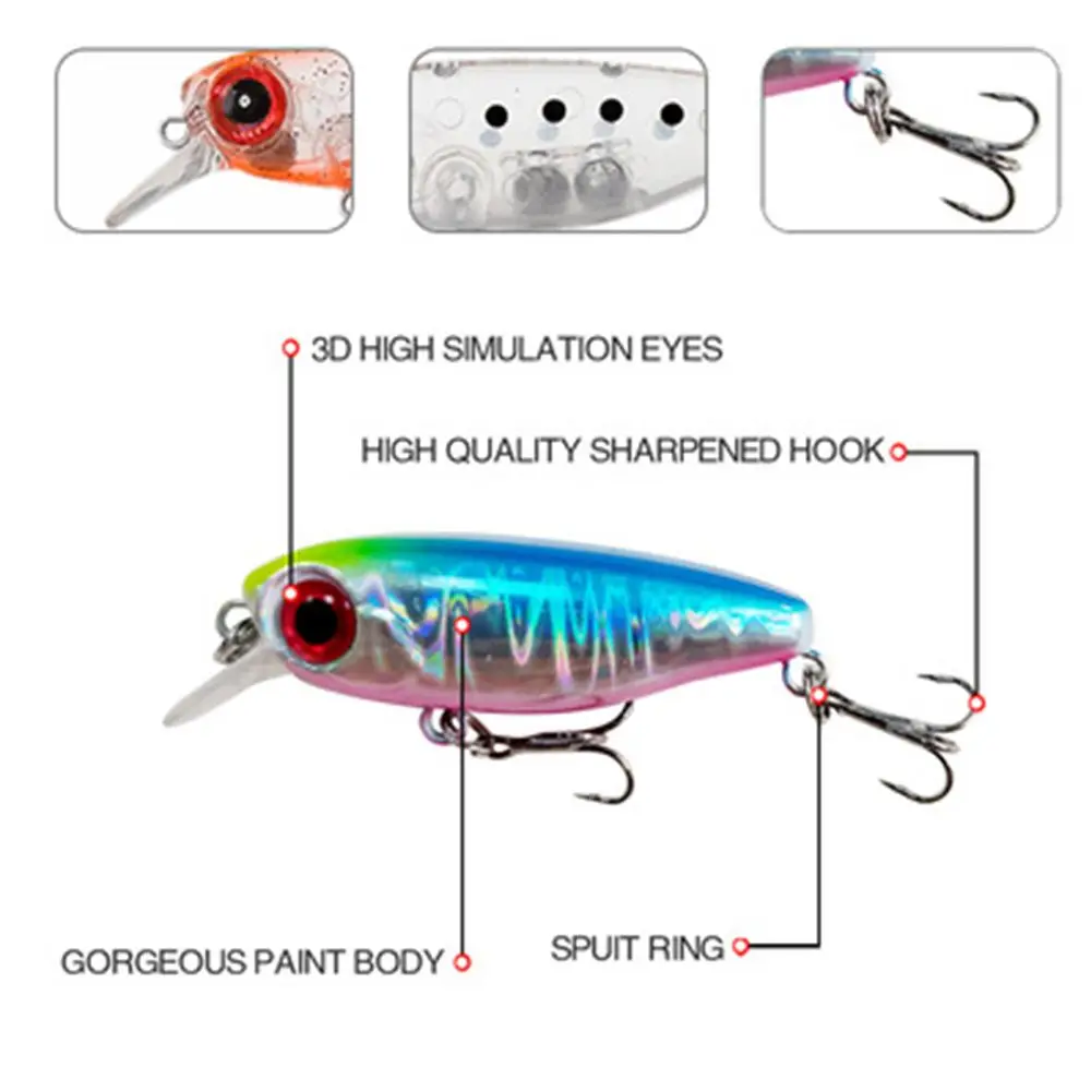 Modelo de señuelo: señuelo de pececillo de doble gancho Tipo de señuelo: señuelo de pesca duro Peso del señuelo: 6g Longitud del señuelo: 50mm Ganchos: equipados con 2 piezas de ganchos anticorrosión Ojos: ojos de pez en 3D Colores: 9 colores Características del producto: 1. Material: plástico ABS, ojo de pez 3D de simulación, tres ganchos. Los ojos 2.3D lo convierten en una herramienta perfecta para los entusiastas de la pesca. 3. El cuerpo colorido hace que los peces sean fáciles de atrapar. 4. Agua y acción rápida. 5. Excelente efecto visual para atraer peces. 6. Este tipo de cebo tendrá una acción de natación animada en el agua, que atraerá la atención y el ataque de los peces. El paquete incluye: 1 ud. De cebos de pececillo