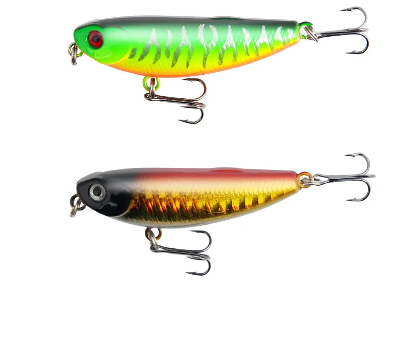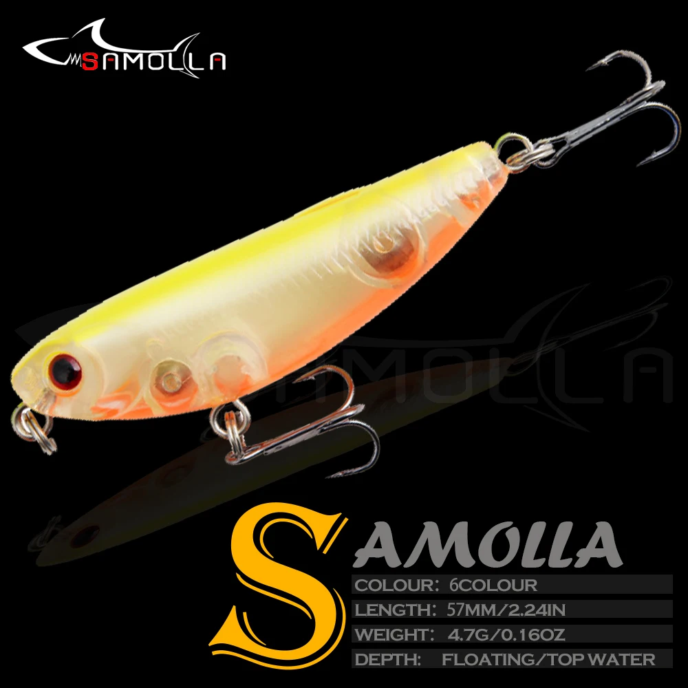 Detalles del producto: Marca: SAMOLLA Modelo de señuelo: lápiz Tipo de señuelo: señuelo de pesca duro Peso del señuelo: 4,7G Longitud del señuelo: 57mm Profundidad de buceo: agua superior Flotabilidad: Flotante Ganchos: Equipado con ganchos anticorrosión de Ojos: ojos de pez 3D Anillos: bicíclicos Colores: 6 colores Características del producto: 1. El cuerpo del cebo adopta materiales avanzados de protección ambiental, no solo tiene una alta resistencia al impacto, sino que tampoco produce sustancias nocivas para el medio ambiente. 2. El cebo está diseñado para tener el mejor equilibrio para que el cebo pueda nadar a la velocidad de recuperación más lenta posible. 3. Los cebos tienen pintura realista y ojos 3D vívidos, hacen que el cebo parezca un pez real nadando en el agua durante la pesca. 4. Cuerpo colorido: Diseño de simulación, más atractivo para los peces. 5. Ganchos: anticorrosión, potencia más fuerte, duradero, agua de mar dulce universal. 6. Bolas de metal: Bolas de acero inoxidable en el interior, para mantener el equilibrio del señuelo de pesca, para la mayor distancia de lanzamiento. 7. Anillos bicíclicos más fuertes: fortalece el círculo doble y aumenta la resistencia a la tracción. 8. Simulación de piel de pez (láser): el diseño de simulación de piel de pez la hace más atractiva para los peces grandes. 9. A diferencia de la popular vinculación de ahorro realizada por empresas populares. Bearking utiliza un proceso detallado que requiere mucho tiempo. 10. El acabado del borde y el proceso de desbarbado de precisión reducen el área apareada áspera de los señuelos a una superficie lisa. 11. Para probar la integridad de la adhesión, los señuelos se prueban con agua, sumergidos en agua caliente que supera los 70 grados durante unos 20 segundos.