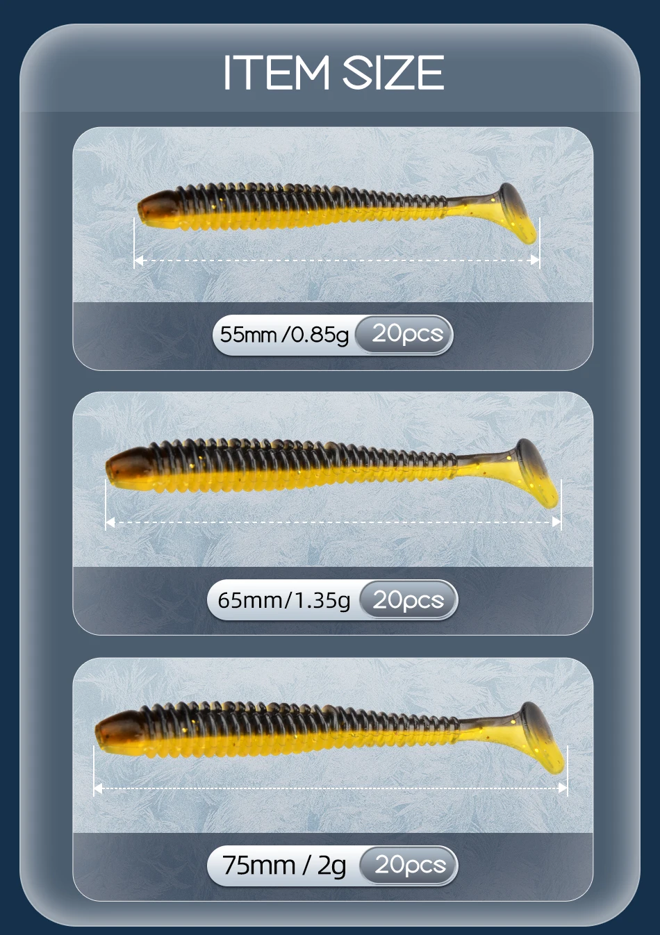 Longitud: 55mm (2,16 ") Peso: 0,85g (0,03 oz) Paquete: 20 unids/lote