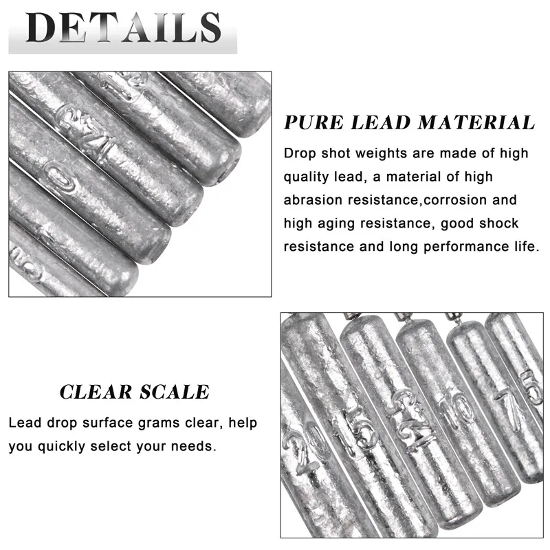 Cantidad: 24 piezas Tamaño: 5G, 7g, 10g, 12,5G, 15g, 20g Material: plomo Modelo: Peso de caída Característica: Diferentes tamaños, más opciones Diseño de caída de peso, fácil de usar Material de plomo puro, alta calidad Nota: Puede haber algunos errores de medición, no se preocupe. Gracias