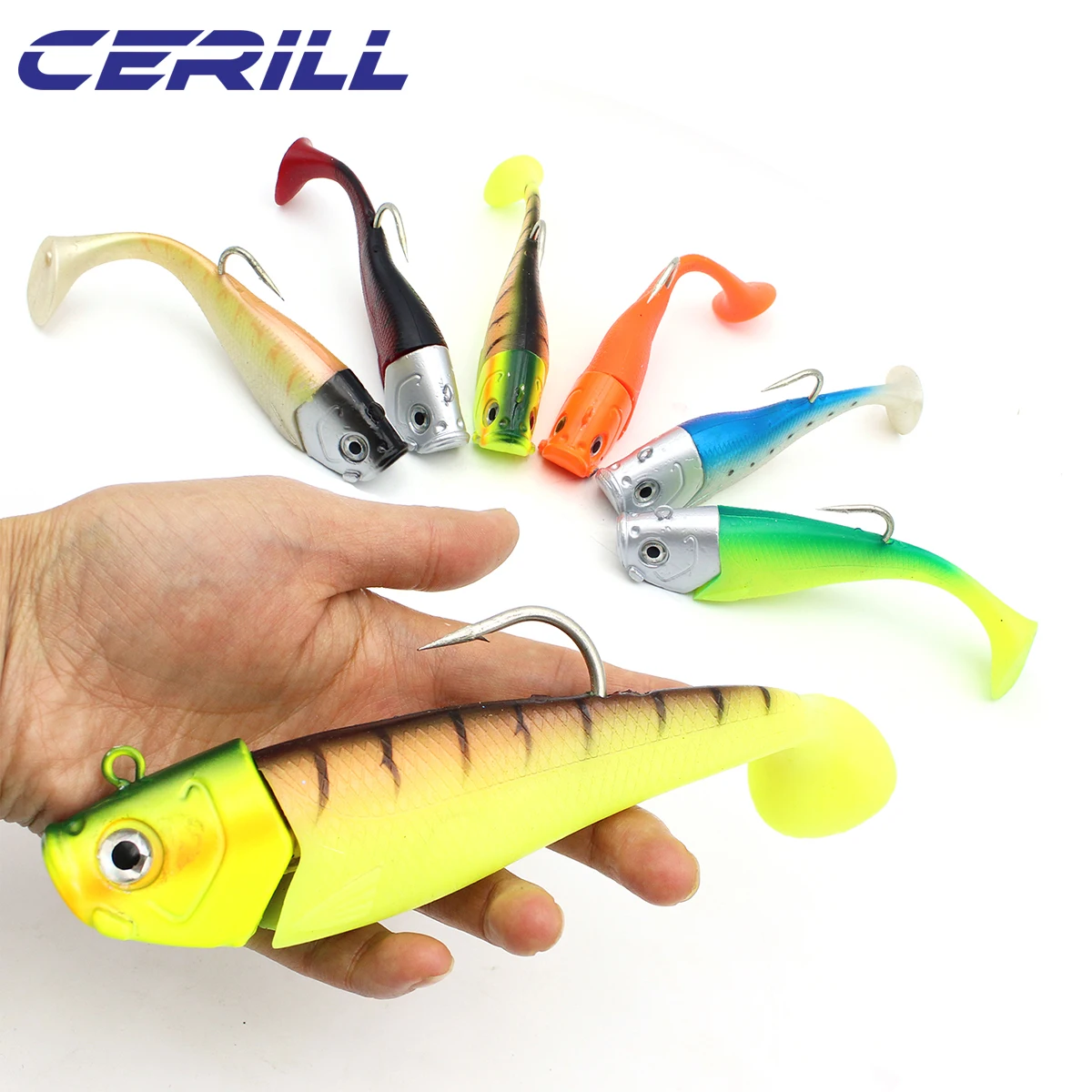 Cerill 190mm 305G 3D Eyes Jigging Wobbler Señuelo de pesca suave Silicona artificial Bass Pike Sea Realista Carpa Plomo Jig Head Bait