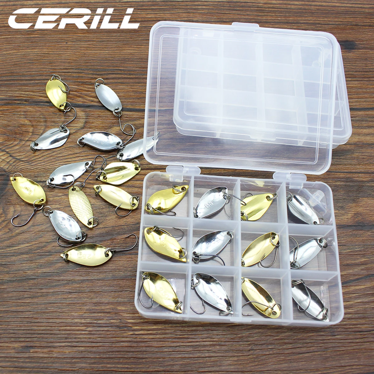 Cerill Juego de Señuelos de Pesca de Metal con Cuchara, Cebo Giratorio Wobbler con Gancho, Kit de Spinnerbait con Caja, Color Dorado y Plateado, 12 piezas