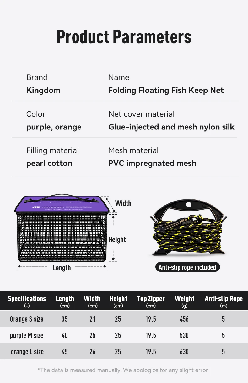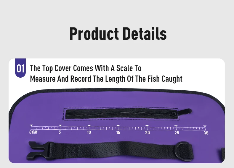 Pequeña apertura en la parte superior con cremallera para evitar que los peces salten o que las corrientes los eliminen.También tiene una escala en la cubierta superior para medir la longitud de los peces capturados.