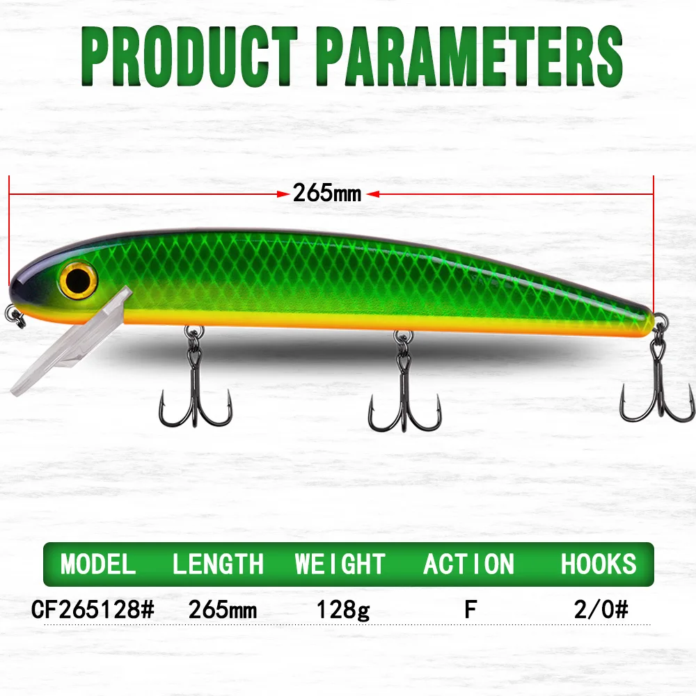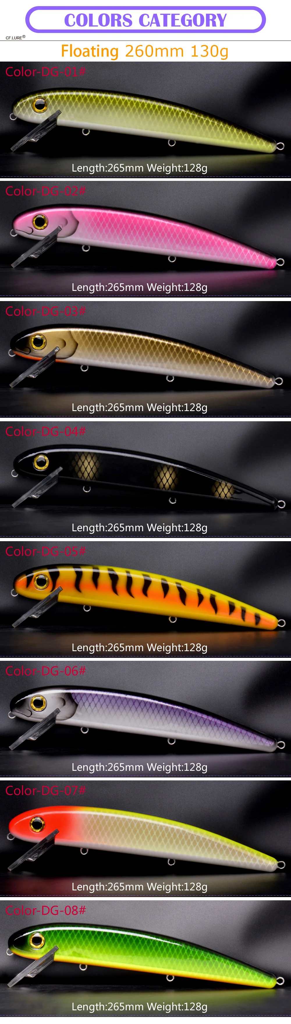 Principales industrias de aparejosMarca: CF.LUREModelo:Longitud: 265mm Peso: 130gTipo: FlotanteSeñuelo trollingGanchos: anzuelos triples reforzados de níquel de origen famoso chino 2/0 #