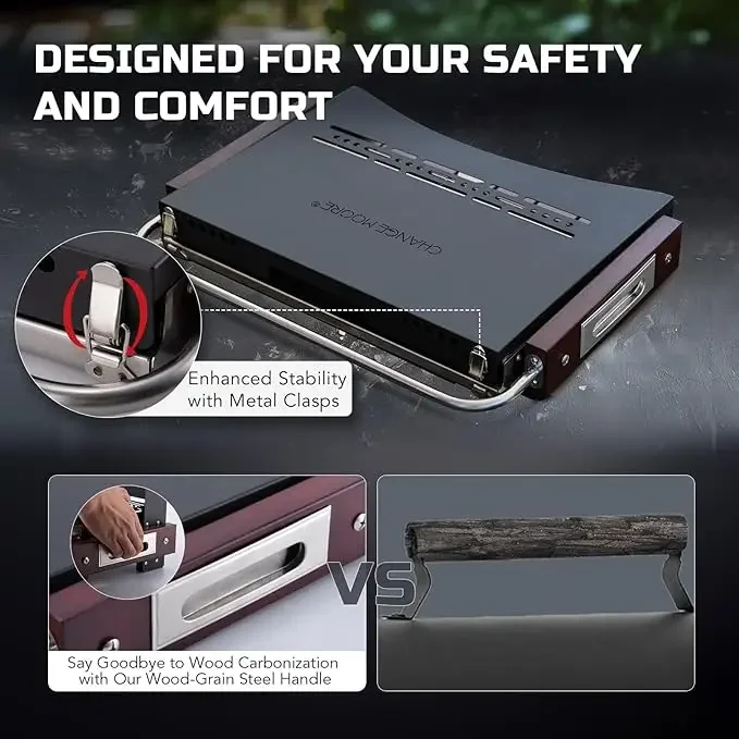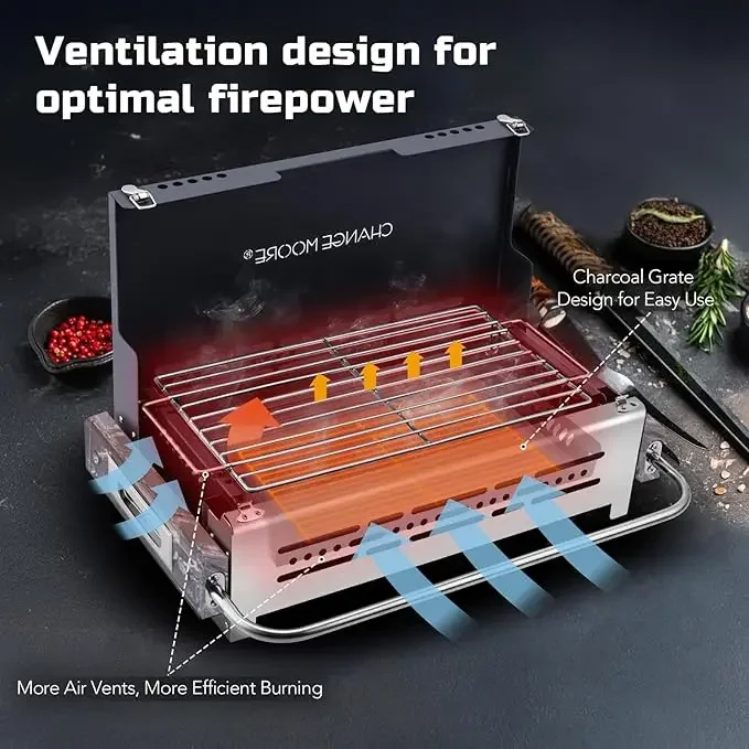 Seguridad mejorada y combustión eficiente: la parte inferior de la mesa para barbacoa está equipada con una malla de carbono que reduce el contacto directo entre el carbón y la placa base, minimizando el riesgo de quemaduras.El espacio añadido también fomenta un mejor flujo de aire, ayudando al carbón a quemarse de manera más uniforme y eficiente.