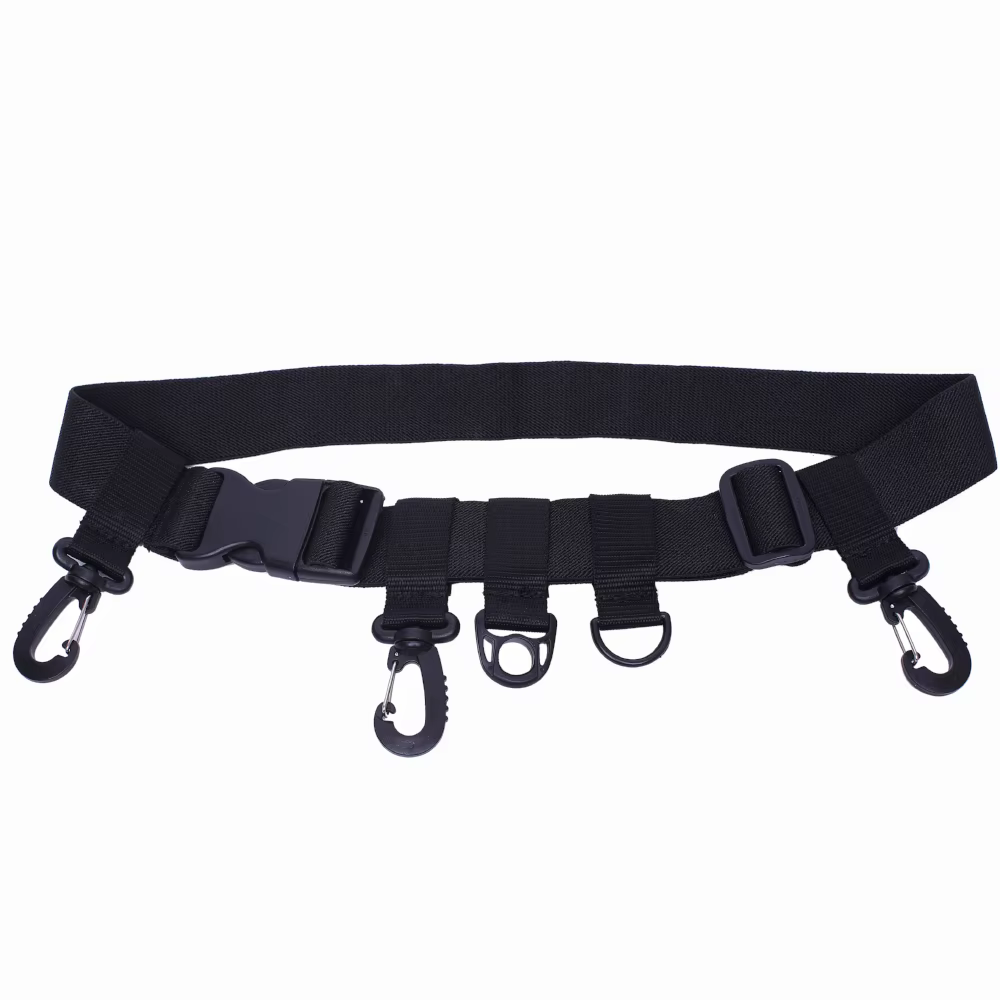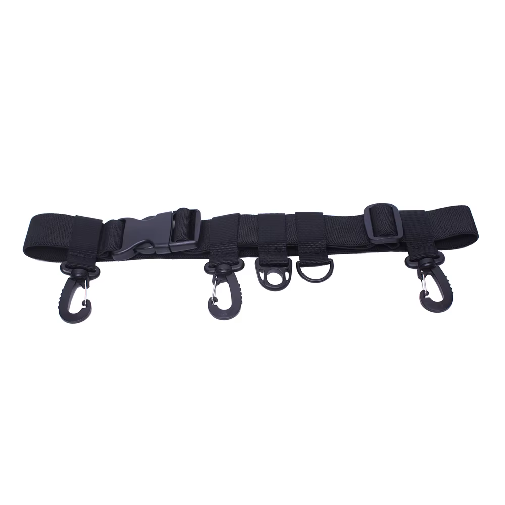 Cinturón negro con 2 anillas en D, 3 anzuelos pesados para colgar accesorios de pesca