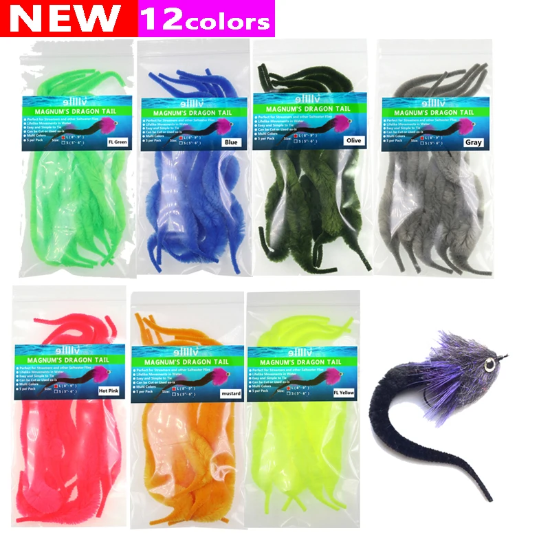 5 unids/pack 12 colores nueva cola de dragón de Magnum para Pike Muskie pesca de agua salada señuelo de mosca Baitfish Material de atado