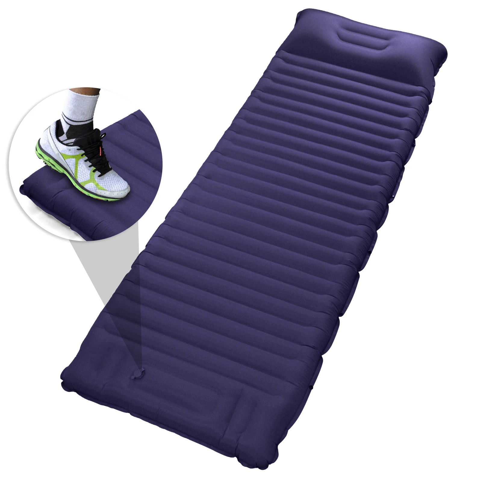 Con bomba incorporada, fácil de inflar la almohadilla para dormir pisando el dispositivo de inflado; Abra la válvula de desinflado para desinflar al instante.