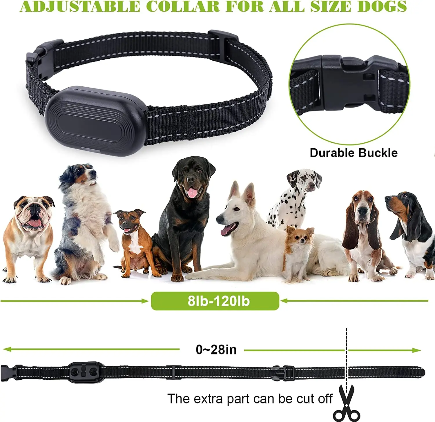 Debería poder poner de 1 a 2 dedos entre el collar y el cuello del perro. Observe la reacción de sus perros y verifique si el collar está bien ajustado. Demasiado apretado o demasiado largo alrededor del cuello puede causar irritación o daño en la piel del perro.