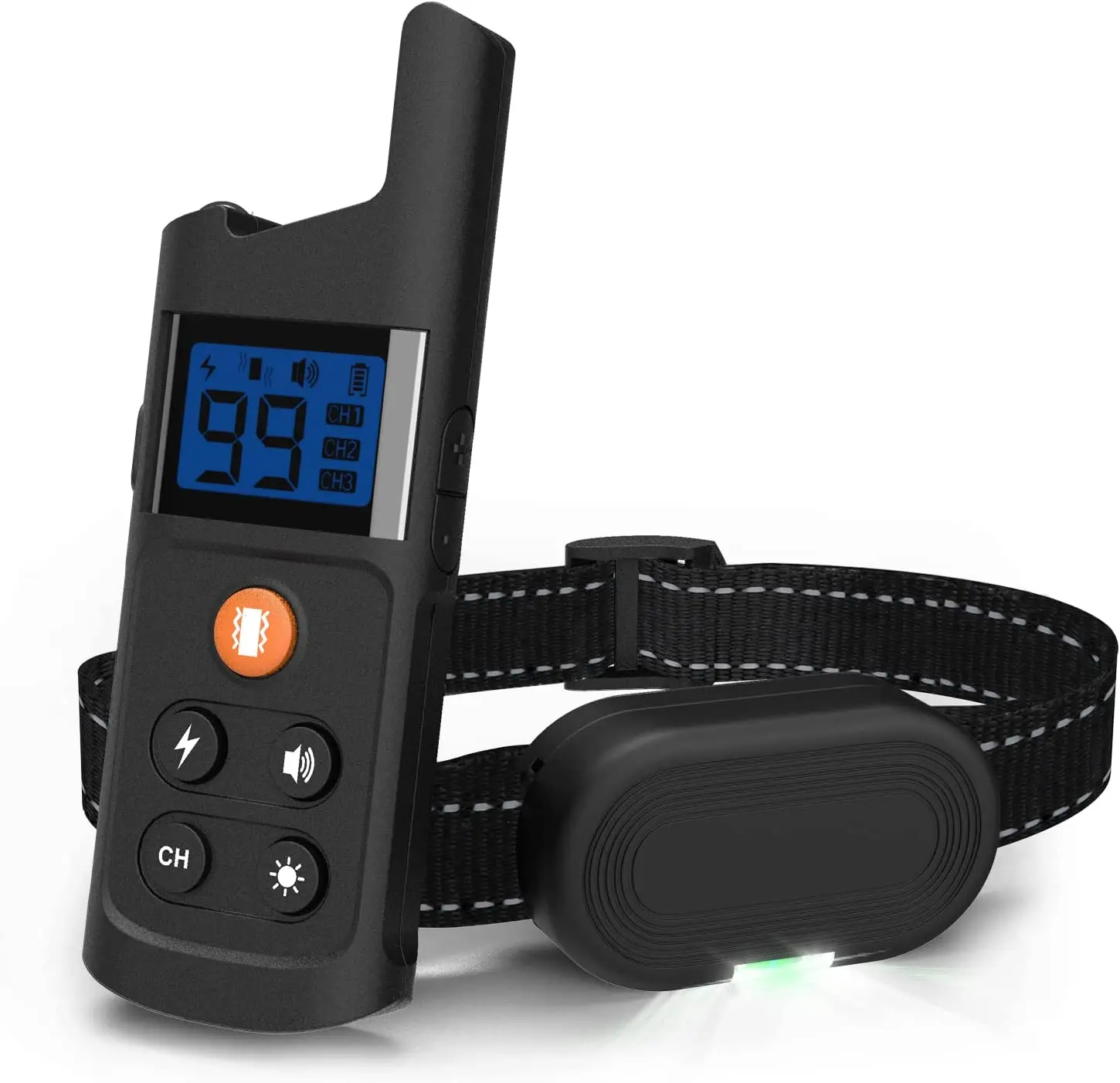 La función de descarga eléctrica debe ser la última opción para entrenar a su perro. Siempre comienza a entrenar a tu perro con la función de vibración y pitido. El nivel predeterminado de vibración y modo de choque es 99. Cuando lo use por primera vez, ajuste pacientemente el nivel de bajo a alto hasta que su perro responda de manera confiable a la estimulación.