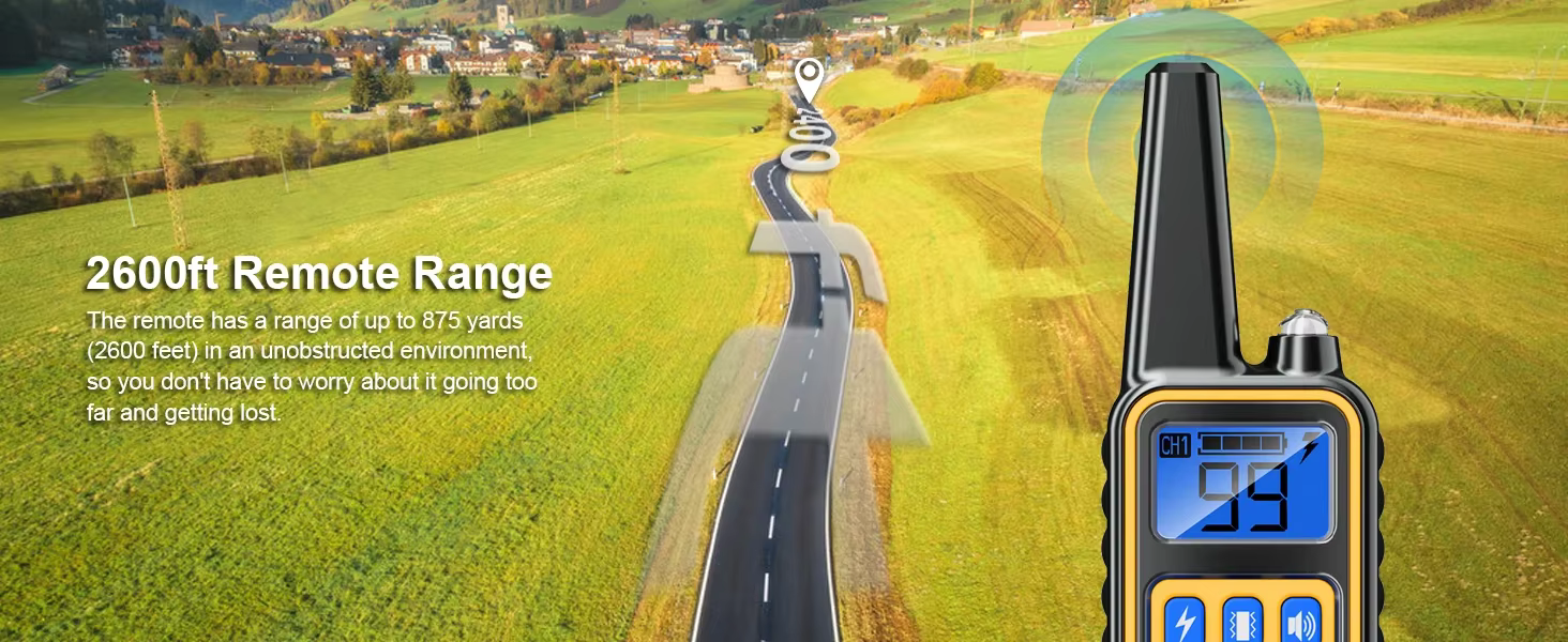 Con un impresionante alcance de 800 m, este collar de control remoto permite a los entrenadores gestionar sus mascotas desde la distancia.