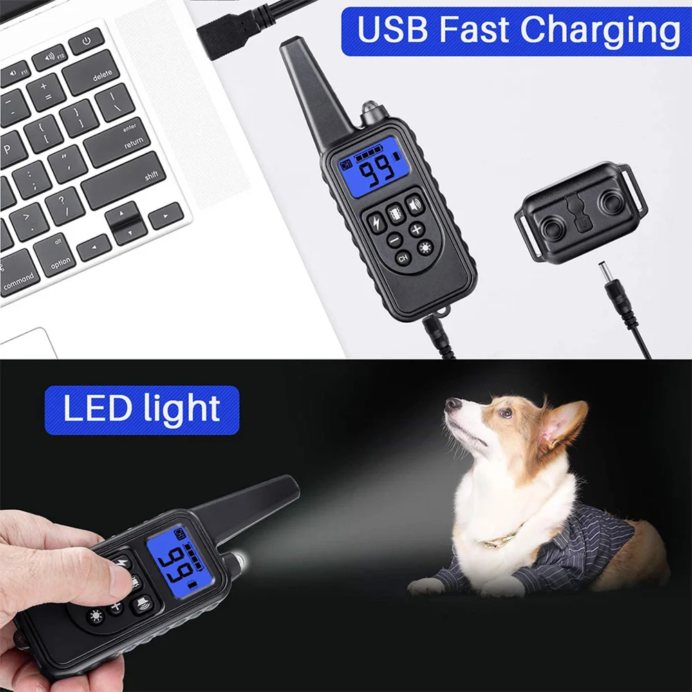 Collar de entrenamiento electrónico ajustable y resistente al agua IP68. Tanto el receptor como el control remoto son recargables. El receptor del collar de entrenamiento es resistente al agua y el control remoto no es resistente al agua, lo que ofrece a sus mascotas la máxima flexibilidad durante las actividades al aire libre.