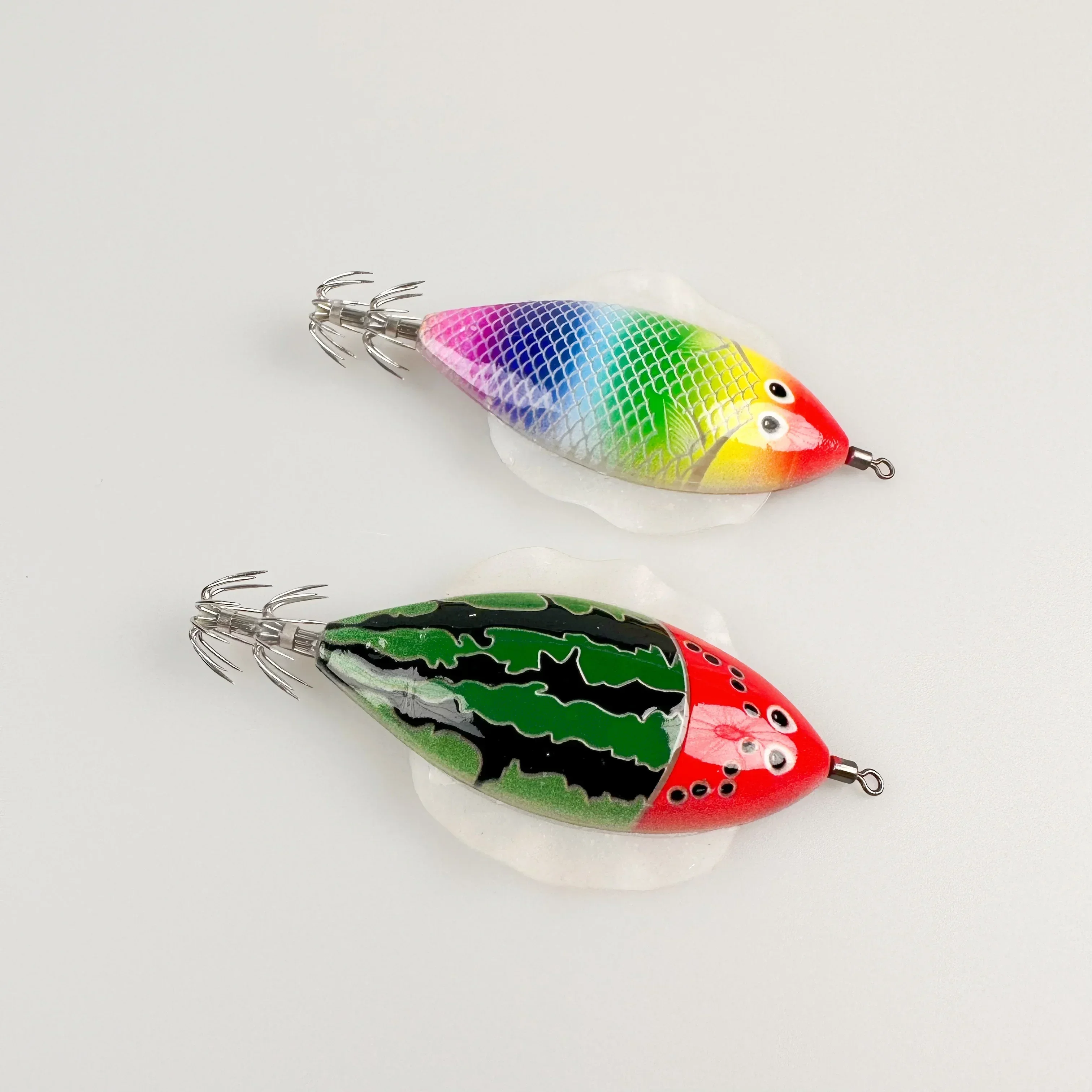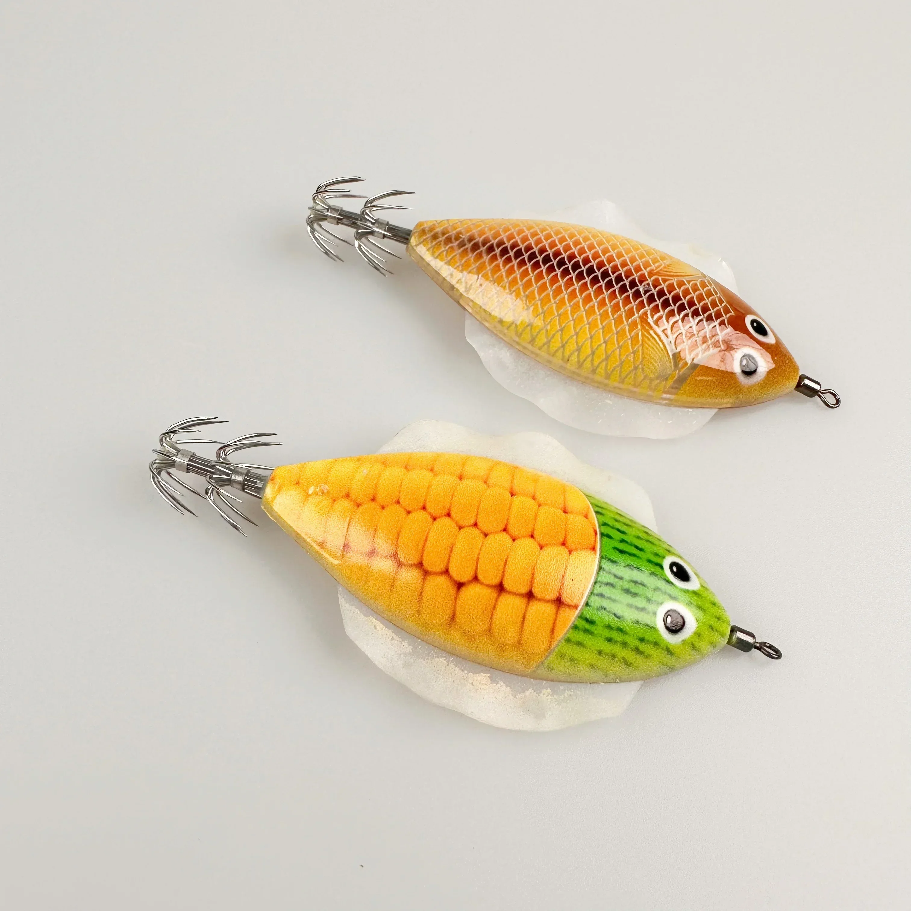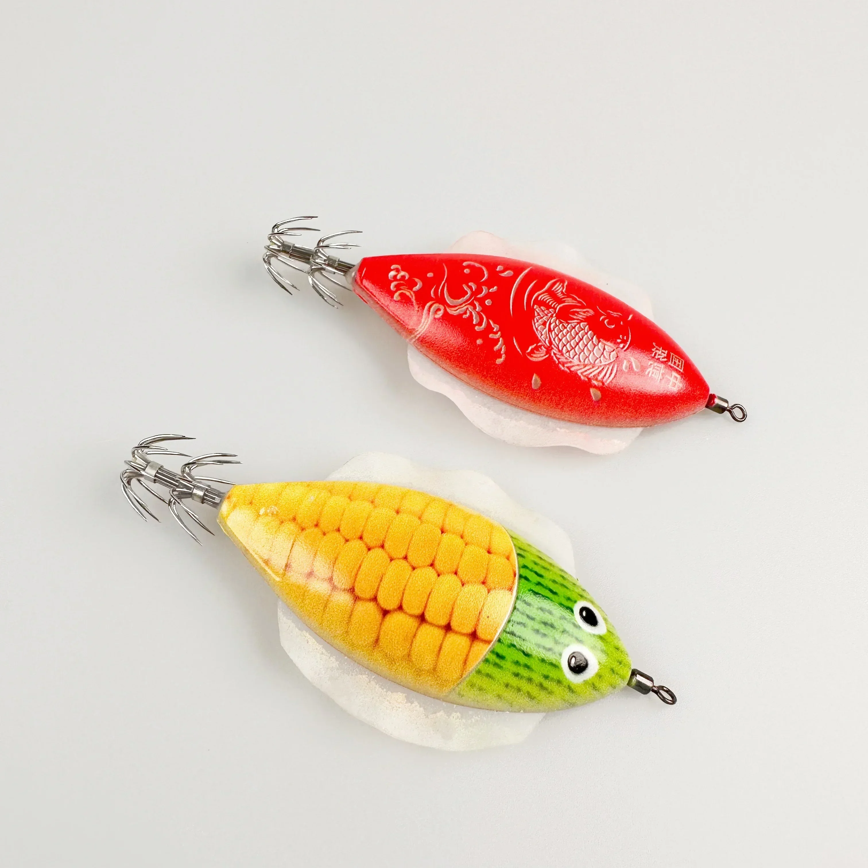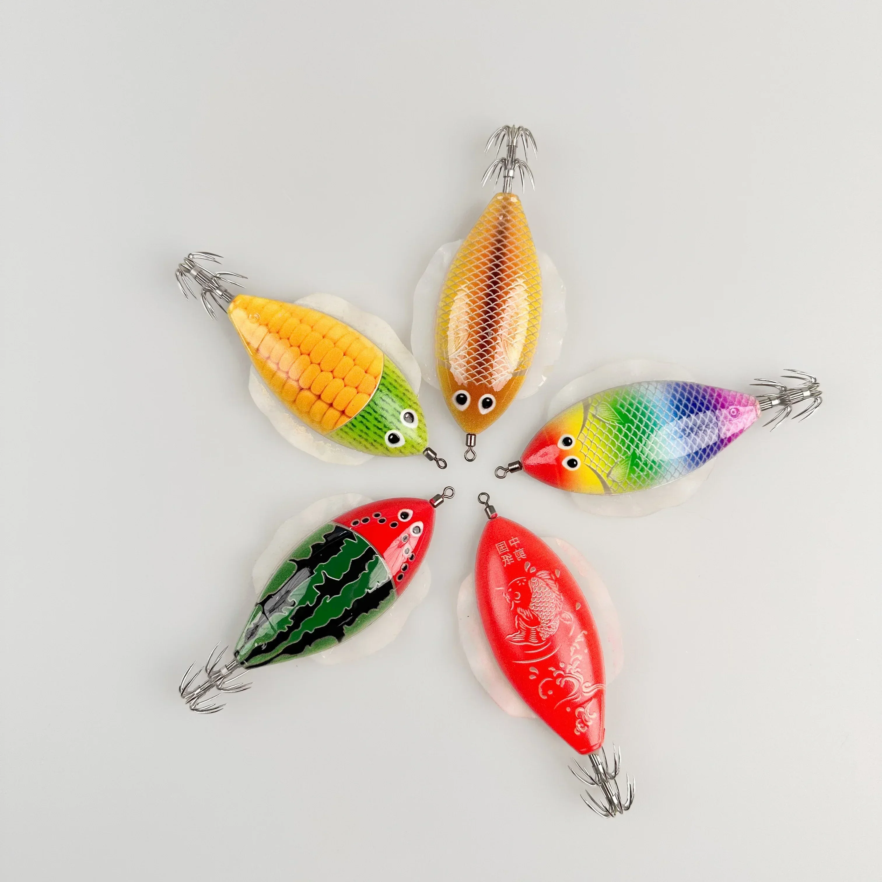 Color aleatorio, 5 uds., anzuelo de madera para camarones, calamar, anzuelo plano de madera para equilibrio de camarones, cebo simulado, cebo de imitación, señuelos de peces de plumas