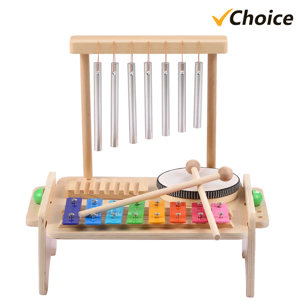 El juego de instrumentos musicales para niños incluye una mesa de música cuadrada con xilófono/tambor/raspador de guiro de madera, campanillas de viento, dos patas de mesa de tambor, dos tapones de madera lisos, es muy fácil de montar.
