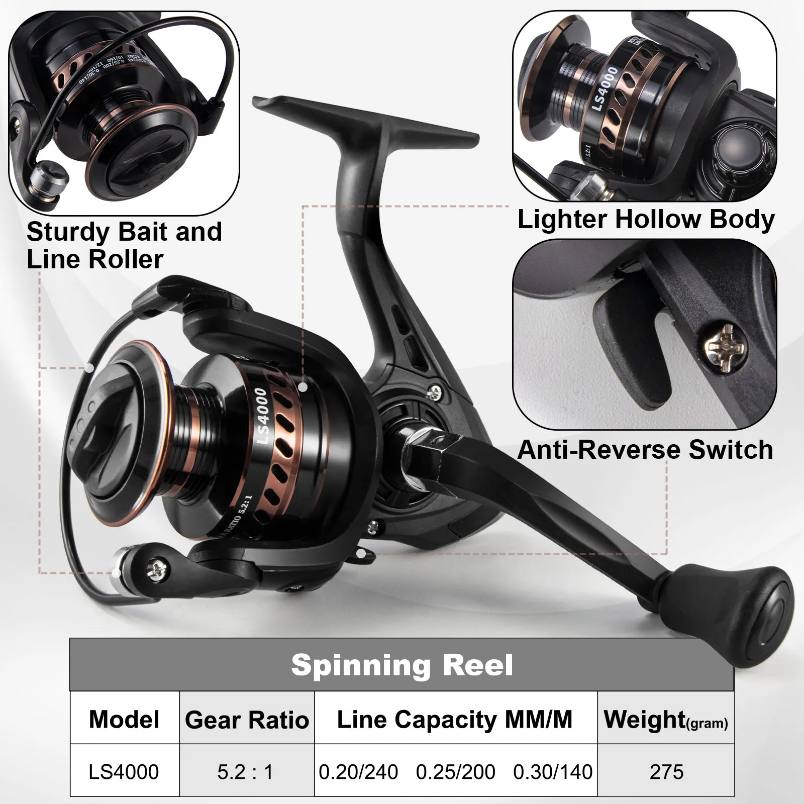 [Buen carrete]: Cuerpo del carrete hecho de material compacto PA66. Los engranajes emparejados con precisión y la relación de transmisión de 5,2: 1 ofrecen un rendimiento suave para la pesca en el mar. El carrete viene con asas de metal intercambiables y plegables. Capacidad de línea (mm/m): 0,2/240 0,25/200 0,3/140, peso 275G