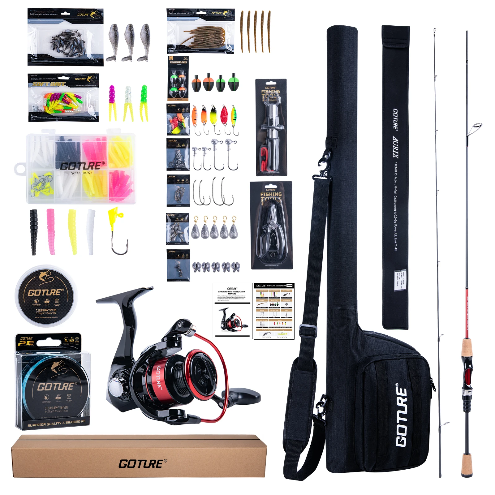 Combo de caña de pescar Goture, 2 secciones, 1,85 m, 1,98 m, aparejos portátiles de fibra de carbono con carrete 5,2: 1 y accesorios de pesca para viajes