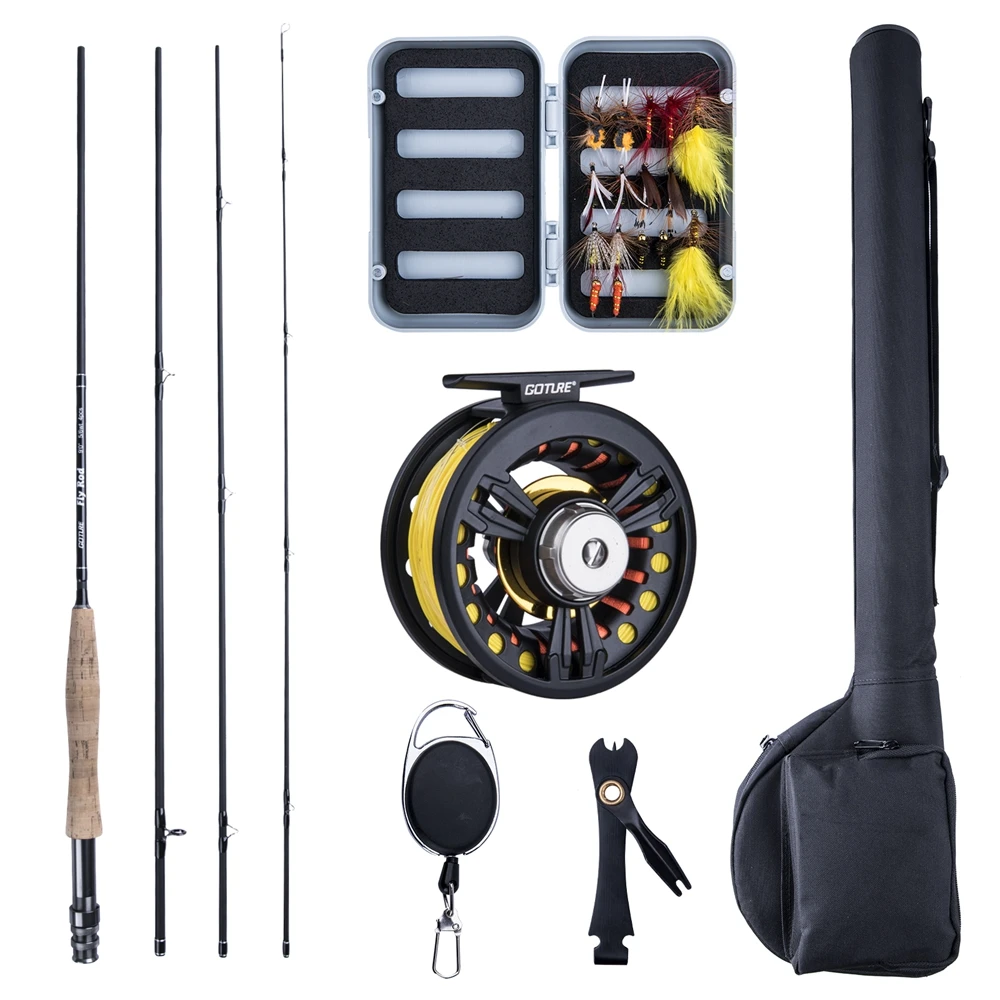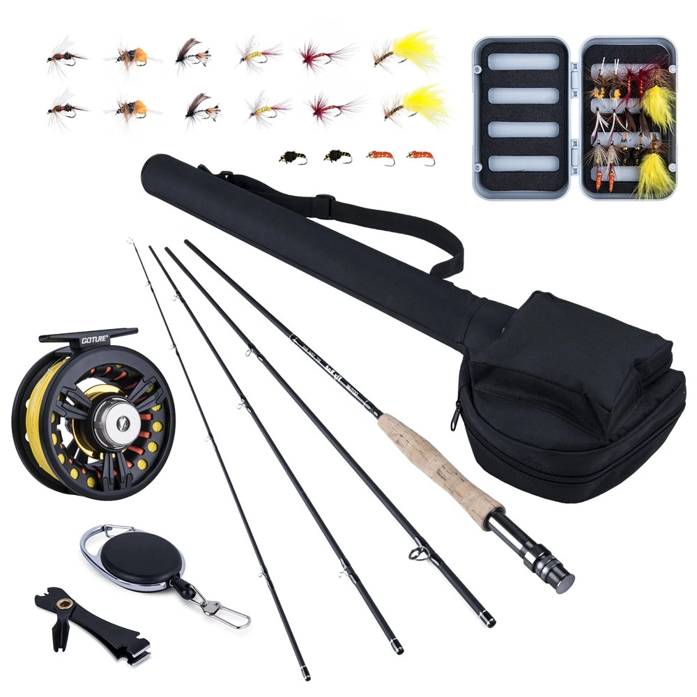 Goture Combo de caña de pescar con mosca 5/6M Carrete de mosca mecanizado CNC Señuelos de línea de mosca de fibra de carbono con caja de aparejos Tubo triangular