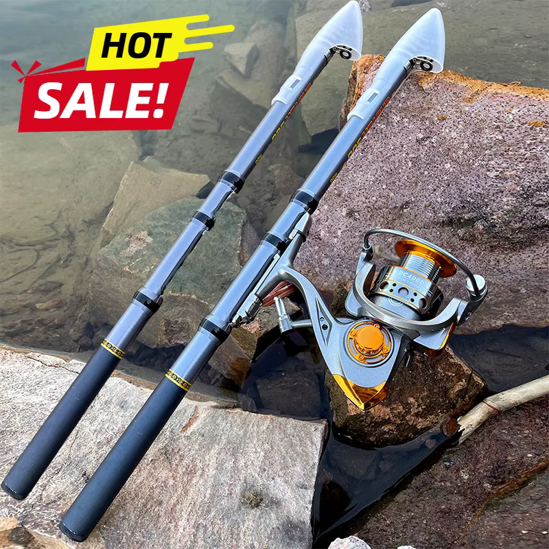 Combo de caña de pescar telescópica en roca de 1,5-3,0 M, caña de carbono corta ultraligera y carrete giratorio, relación de engranaje 5,2: 1, arrastre máximo de 8kg
