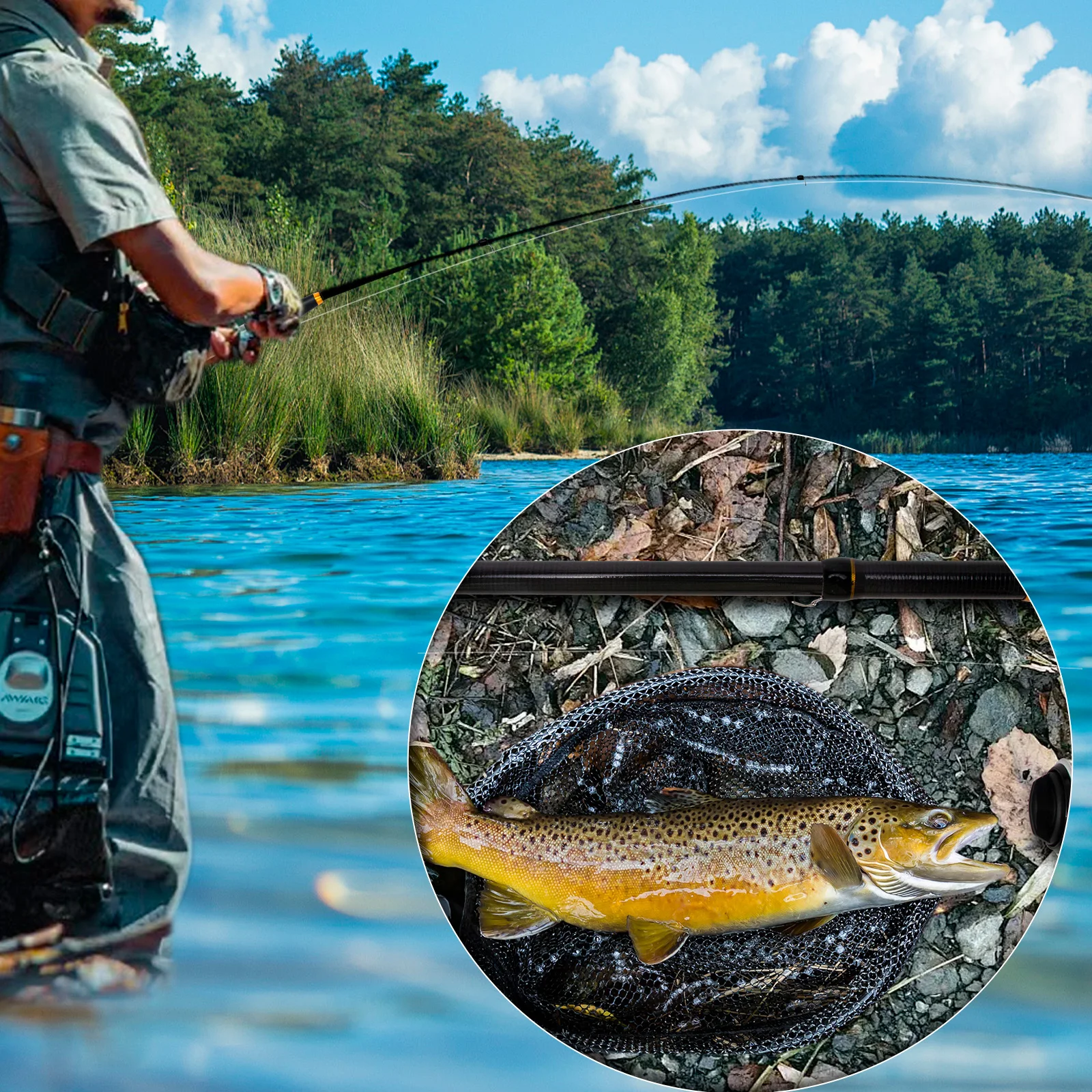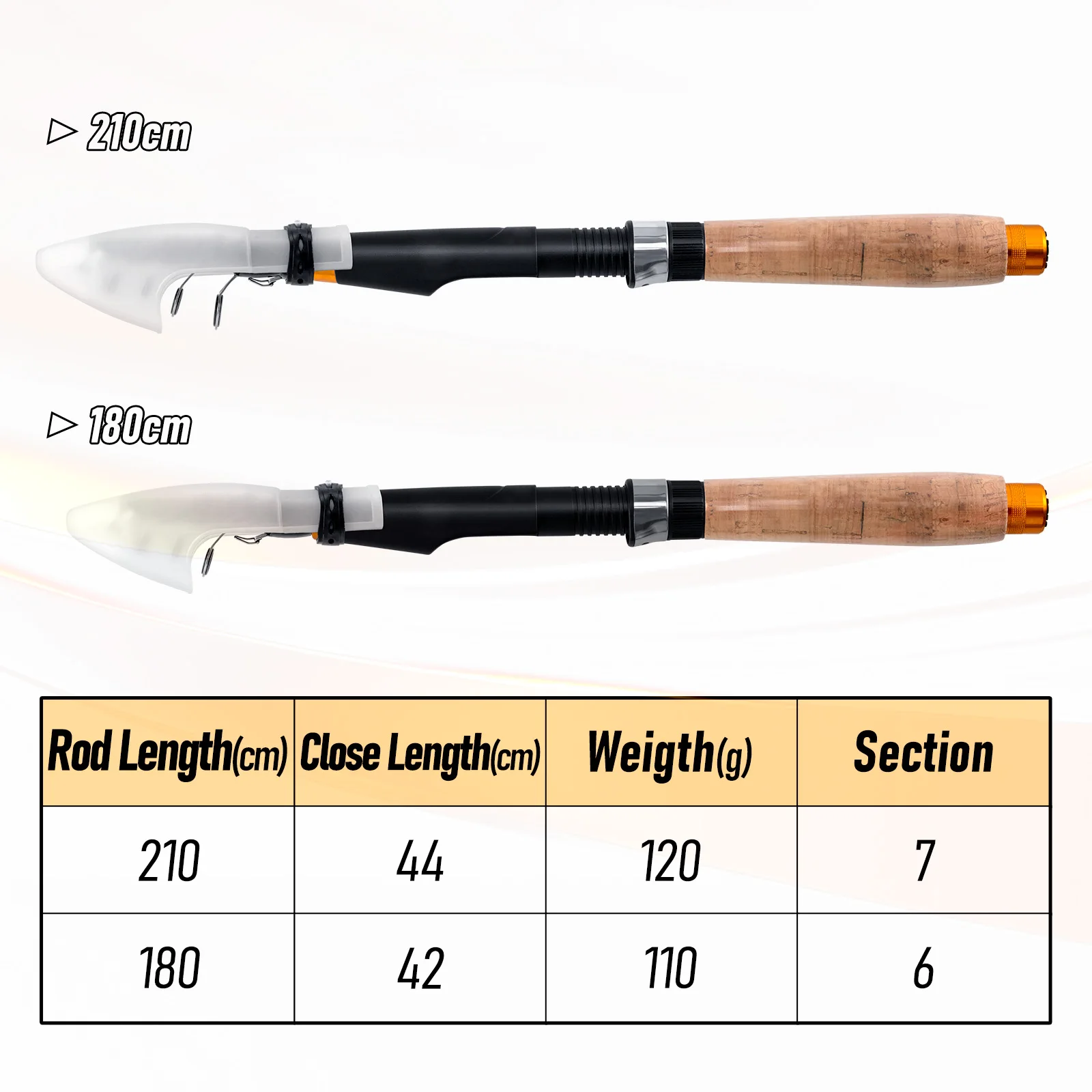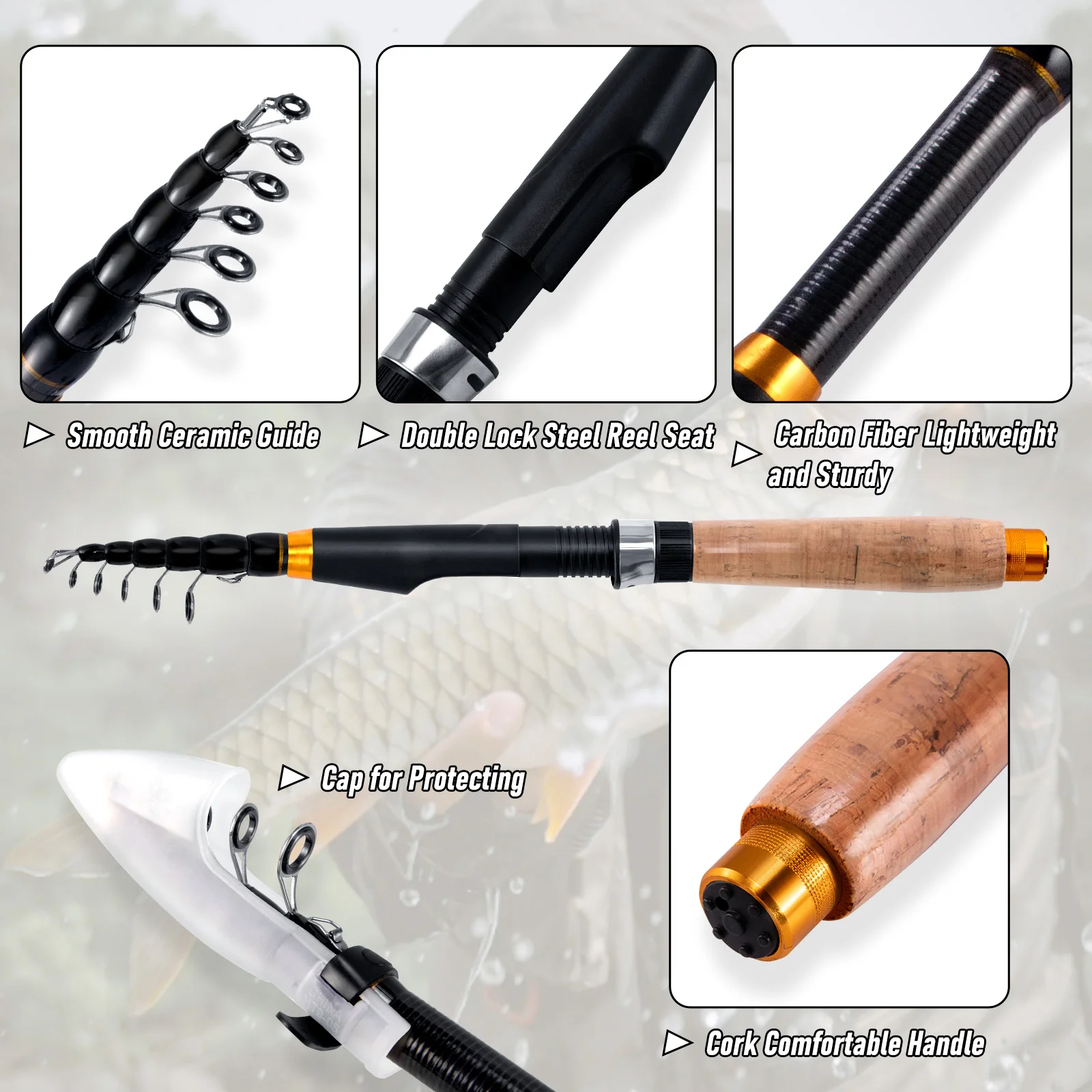 [Caña de pescar con mango de corcho]: hecho con fibra de carbono de alta densidad, 5 capas de tela de carbono, peso ligero y duradero. Encogible hasta 42cm-44cm, guías de cerámica de alta calidad para reducir la fricción y no dañar el sedal. El mango de corcho de alta densidad tiene un diseño ergonómico, cómodo y antideslizante.